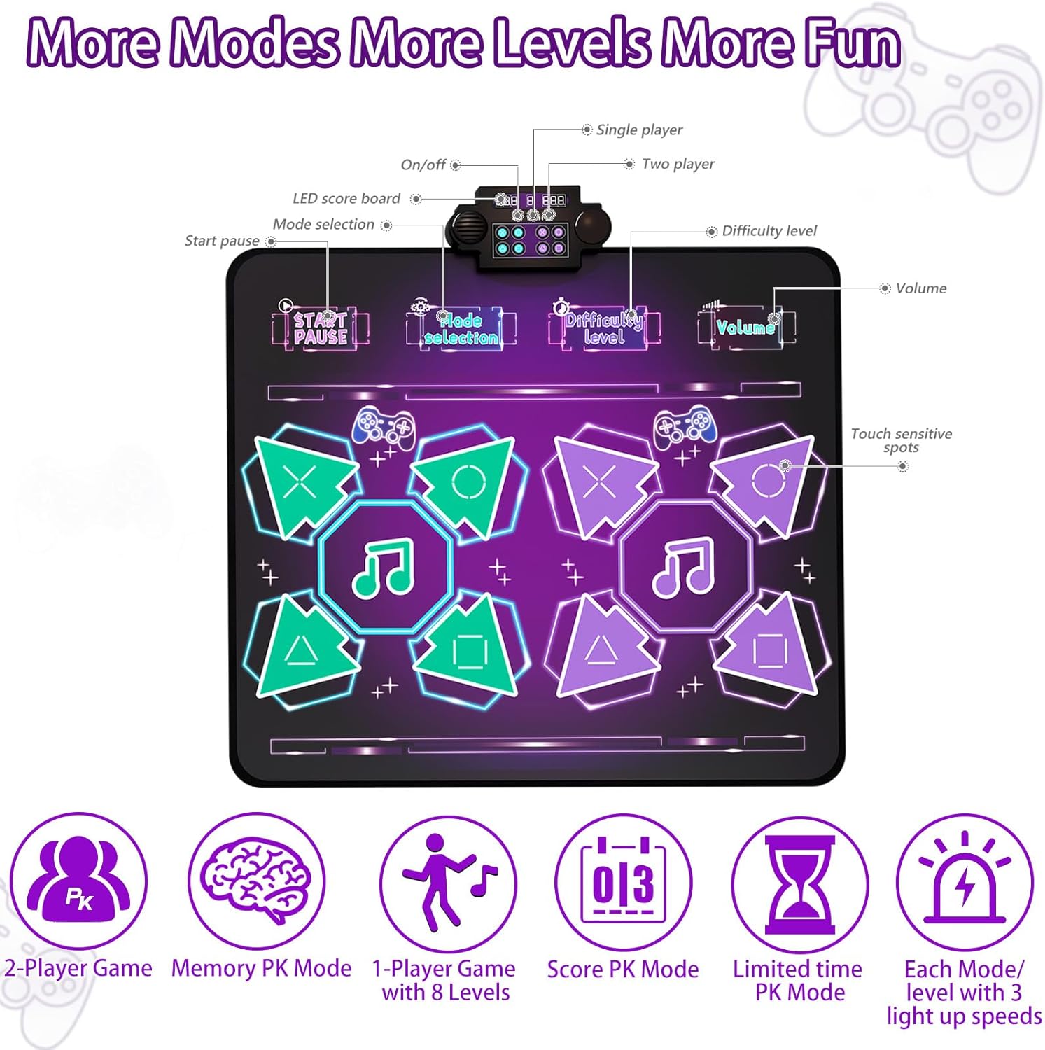 - 1-Player Mode with 8 Challenge Levels --- The dance mat 1-Palyer Mode features 8 dancing challenge levels and each challenge level with 3 difficulty speeds. Follow the beat of the built-in music, dance to the cues of the blinking on the dancing mat and start the challenge game. Perfect 3 4 5 6 7 8 year old girl birthday gift ideas Christmas toys.