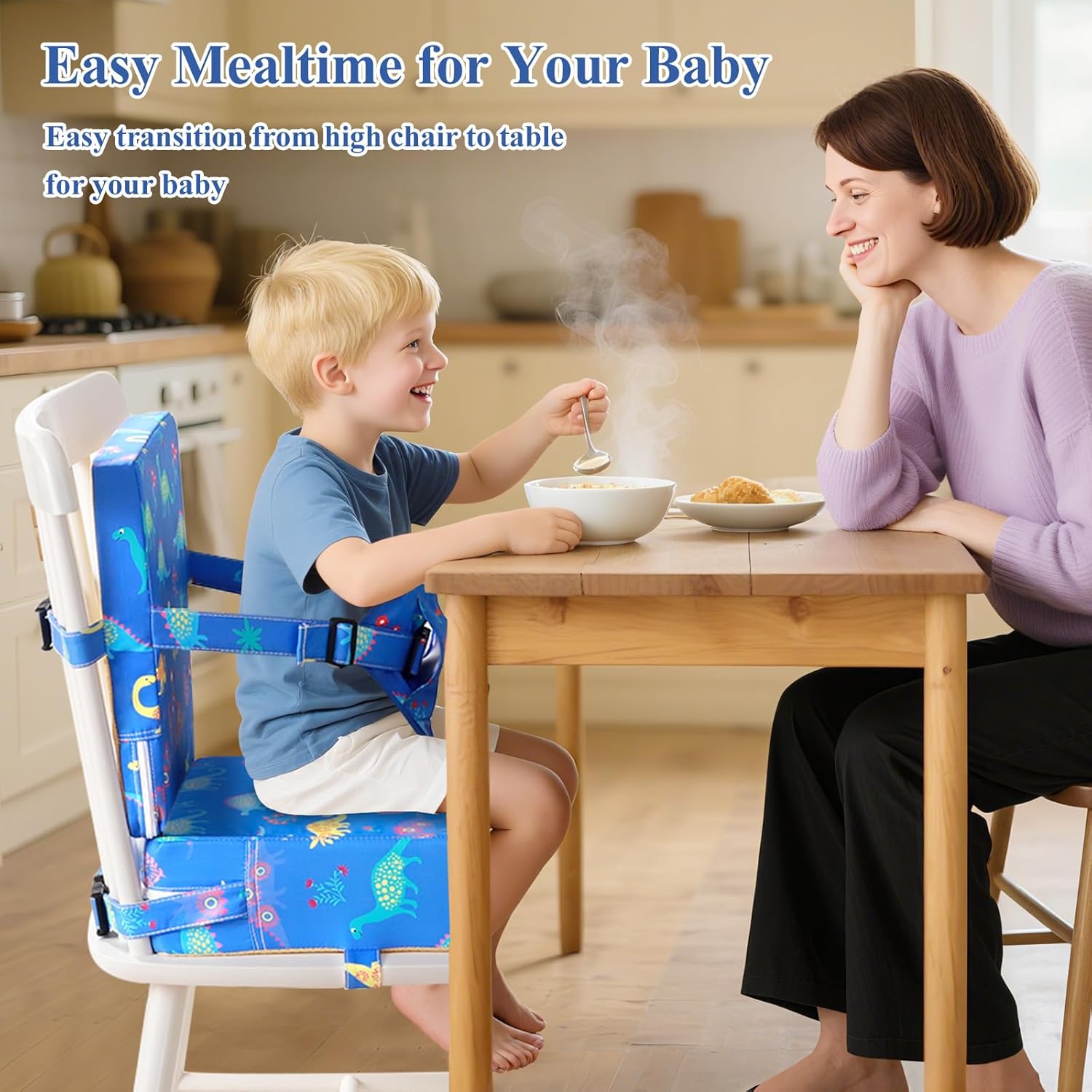 - [Safe & Non-Slip] The Non-Slip design at the bottom and adjustable straps attach to chairs to prevent the baby booster seat from sliding forward or left or right. The kids booster seat for table makes sure that the booster seat will not slip off so that toddler can eat safely