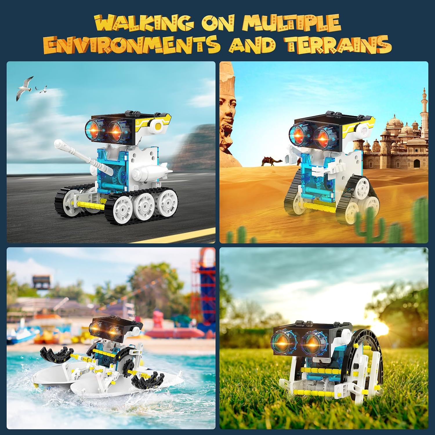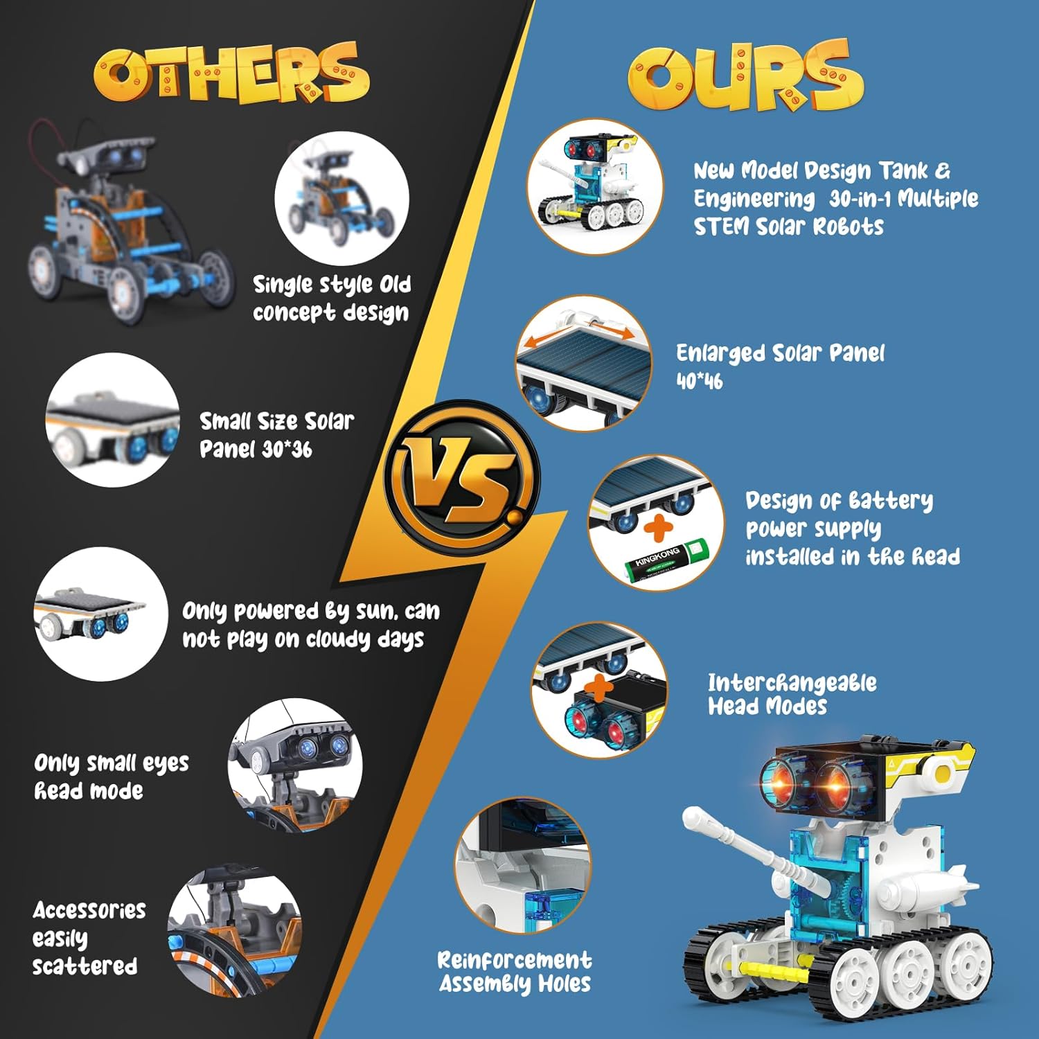 - Upgrade Design Features-Independently Wesfuner 2023 innovated and designed and upgraded STEM solar robots toys kits, the following 5 features optimization improvements: Two new concept shapes tank and engineering vehicle, 2 kinds of power source supply, enlarged solar panel area, 2 kinds of replaceable heads, large-size accessories and deepening the optimization and improvement of the installation hole, accurate track design, more firm, solve the problem that accessories are easy to fall off
