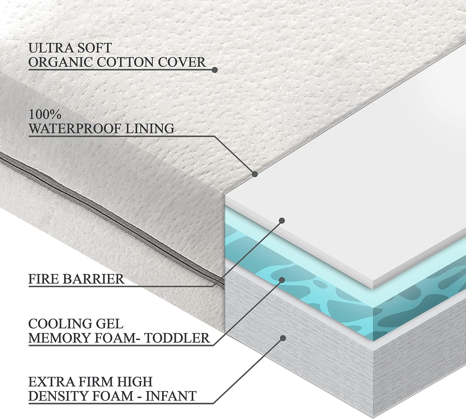 - EASY-CLEAN ORGANIC COTTON | Our Reversible Toddler Mattress Set Includes a Waterproof Exterior Protector for Shielding the Mattress from Dirt, Dust, Liquid Spills & Nighttime Accidents | Eco-Friendly Hypoallergenic Cotton Won’t Expose Your Baby to Harsh Chemicals or Irritants | Remove Via Zipper for Easy Machine Washing