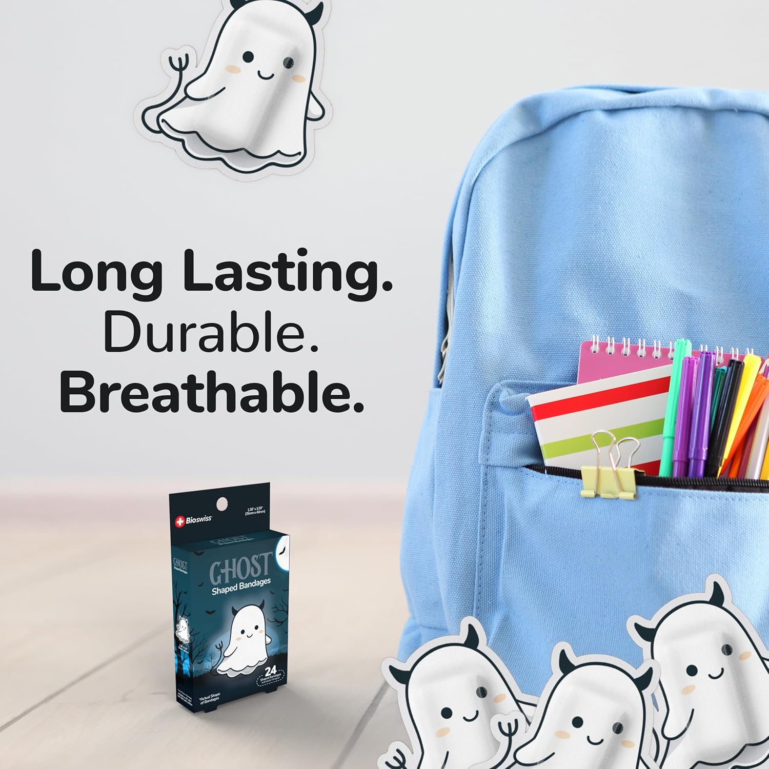- GHOST HALLOWEEN BANDAGES: This 24 piece pack of frightfully fun Halloween Ghost bandages is great for putting a smile on kids' faces while protecting wounds such as cuts, scrapes, and burns; sticky bandages are perfect for kids and adults alike, and also for school nurses and pediatric doctors