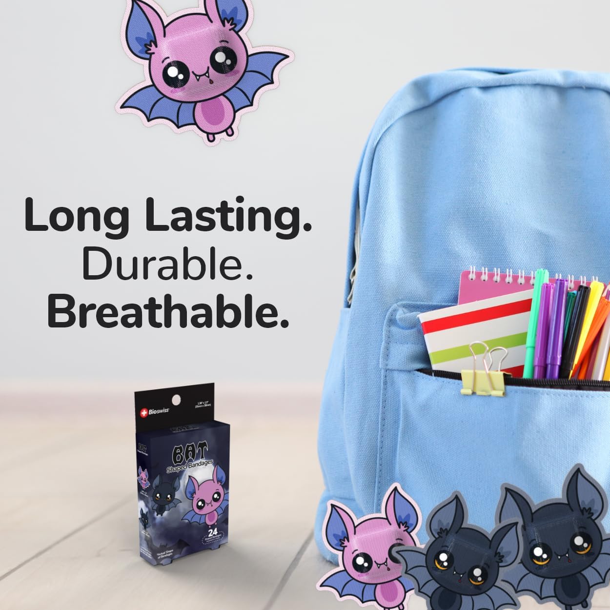 - BAT HALLOWEEN BANDAGES: This 24 piece pack of frightfully fun Halloween Bat bandages is great for putting a smile on kids' faces while protecting wounds such as cuts, scrapes, and burns, and come in 2 styles; sticky bandages are perfect for kids and adults alike, and also for school nurses and pediatric doctors