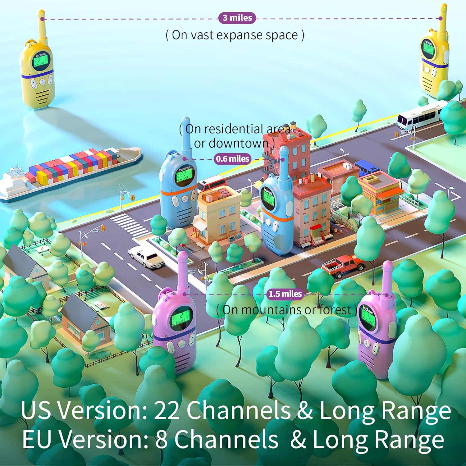 - With clear sound and long range capability, these two-way radios provide 22 channels and work up to 3 miles in open areas. Kids can enjoy stable and clear communication from half a mile to one mile in typical environments. Please note that hills or buildings may affect the range.