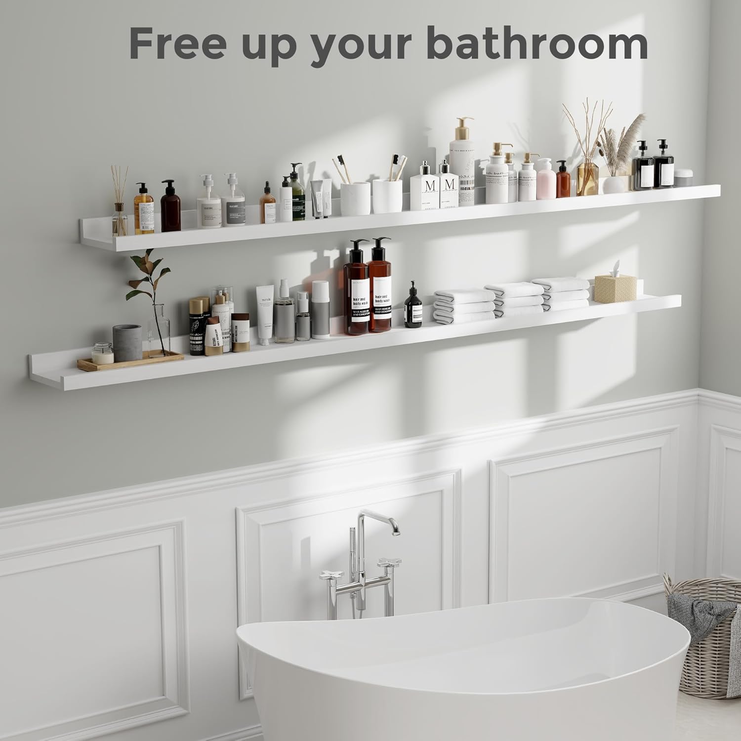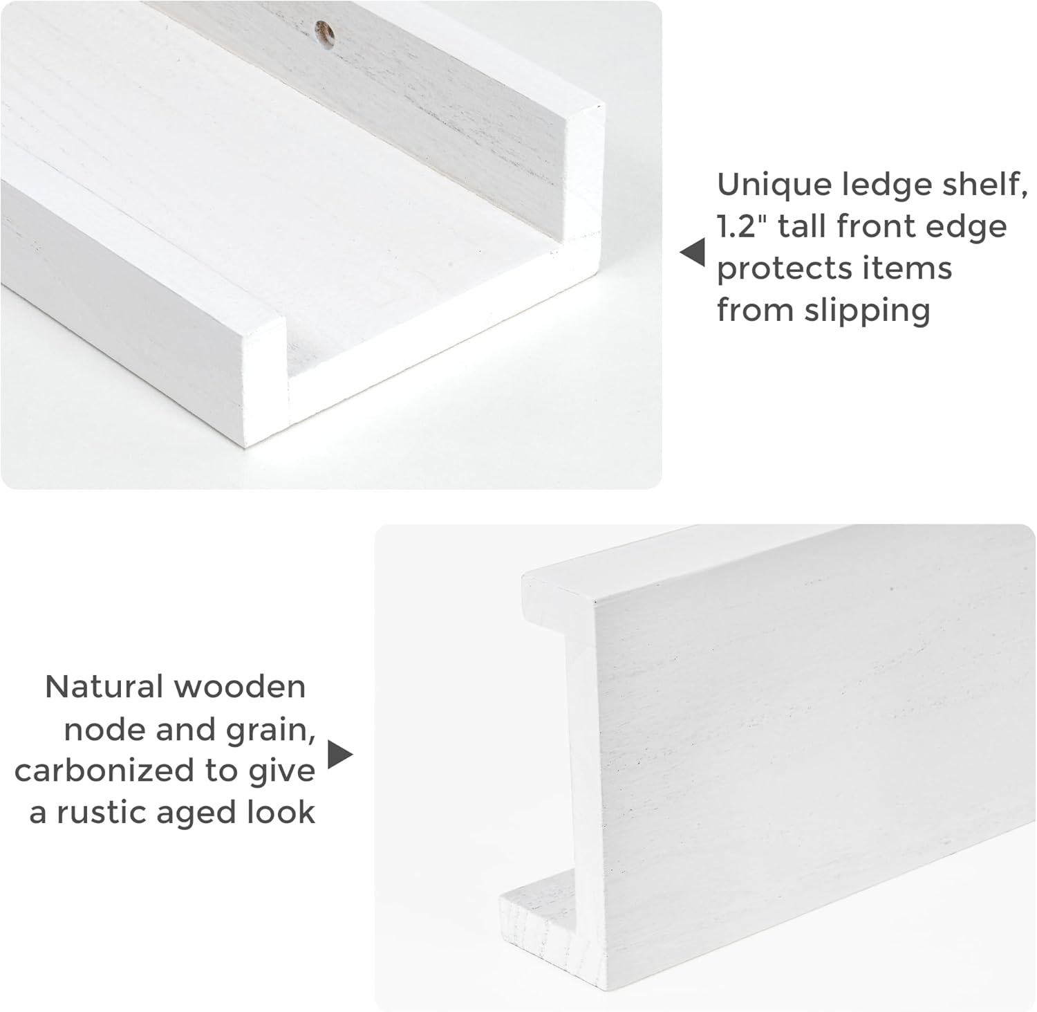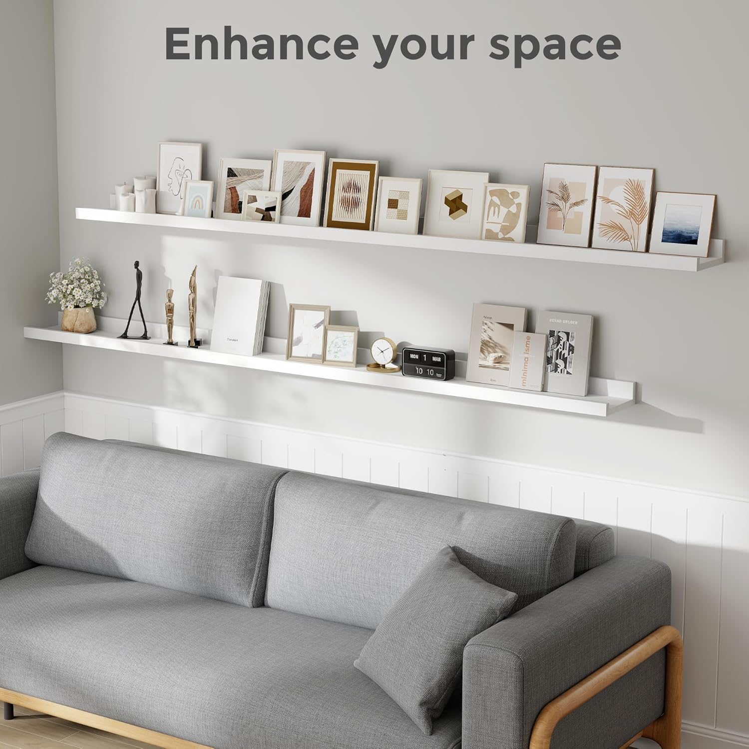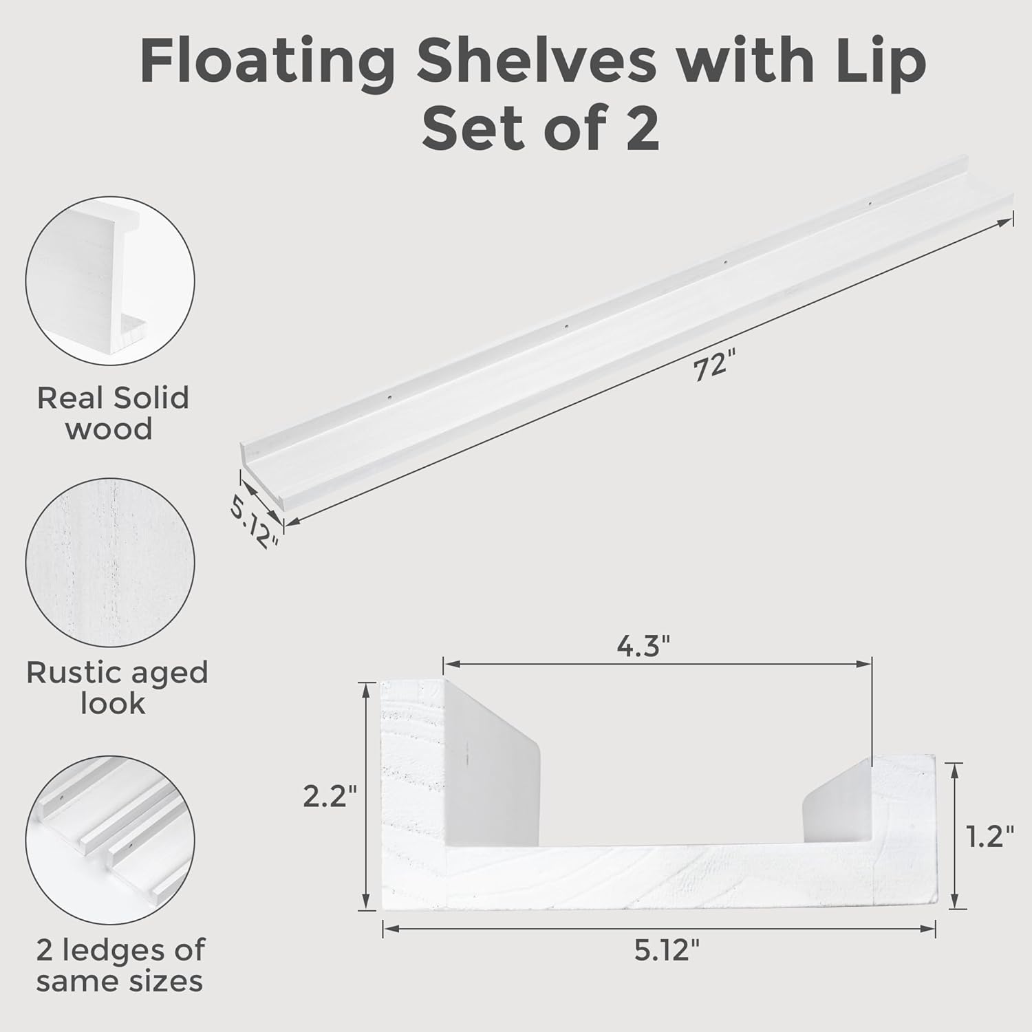 Fun Memories 72 Inch White Picture Shelves for Wall with Ledge, Natural Wood Floating Shelves with Lip, Set of 2, Farmhouse Rustic Wall Shelf Photo Shelf Nursery Bookshelf for Living Room, Kids Room