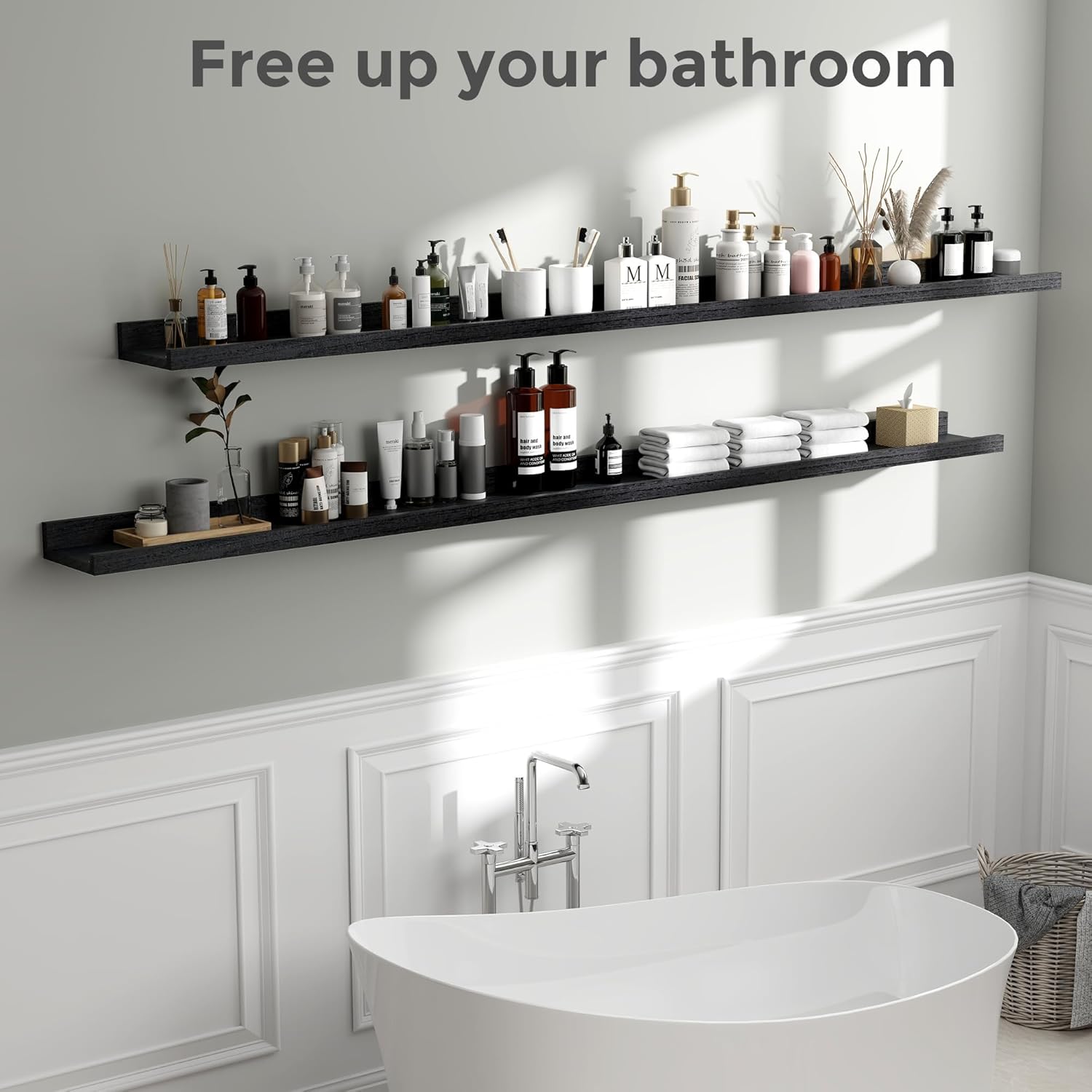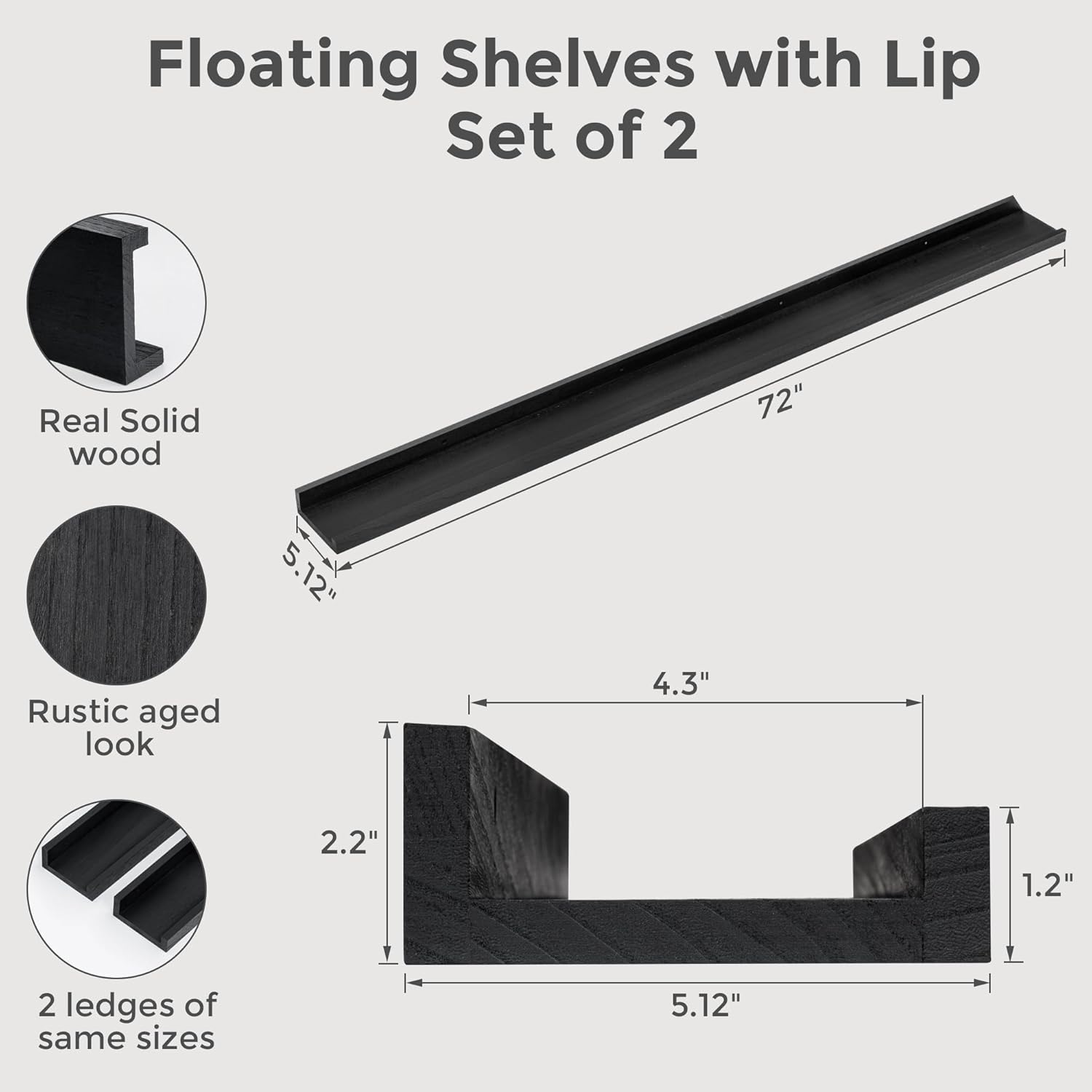 Fun Memories Black Long Picture Shelves 72 Inch, Solid Wood Floating Shelves Photo Shelf with Lip, Large Wall Mounted Display Shelves for Living Room, Bedroom, Kitchen