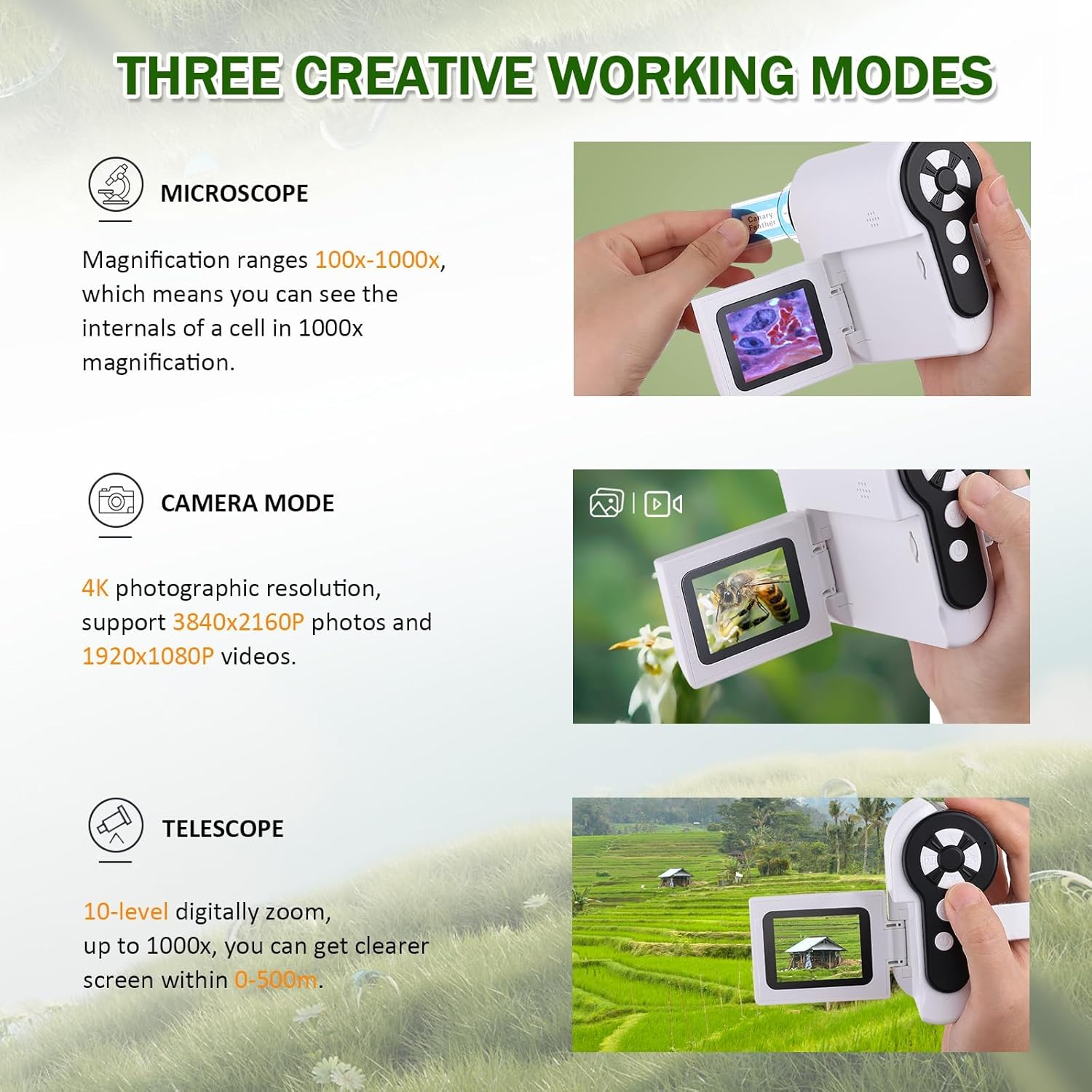 - 𝟯-𝗜𝗻-𝟭 𝗗𝗲𝘀𝗶𝗴𝗻: 1) Microscope Searching, 2) One-Click Photo & Video Recording, 3) Telescope, choose what you want to enhance child's learning experience. And this digital microscope made of 4K resolution, provides much higher clarity