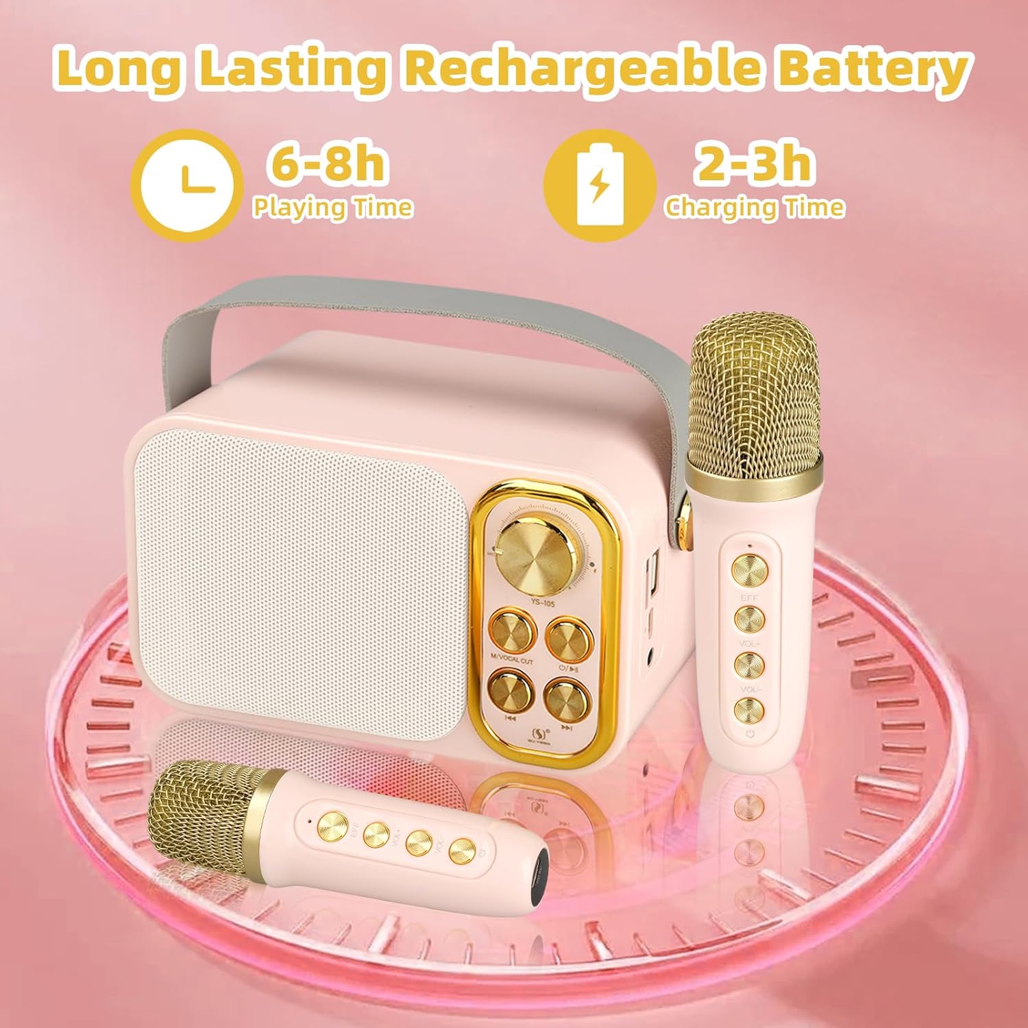 - ♪ 🎤【Excellent Karaoke Speaker】This karaoke speaker is equipped with a strong subwoofer for full range stereo sound reproduction and amplifying your voice, which makes the bass stronger and more balanced, plus it does not distort the audio even at higher volumes. 1500mAh rechargeable battery, which can play music uninterrupted for up to 5 hours. So you can rock out to your favorite songs without the restrictive cords whether it's at an indoor dance or outdoor gathering.