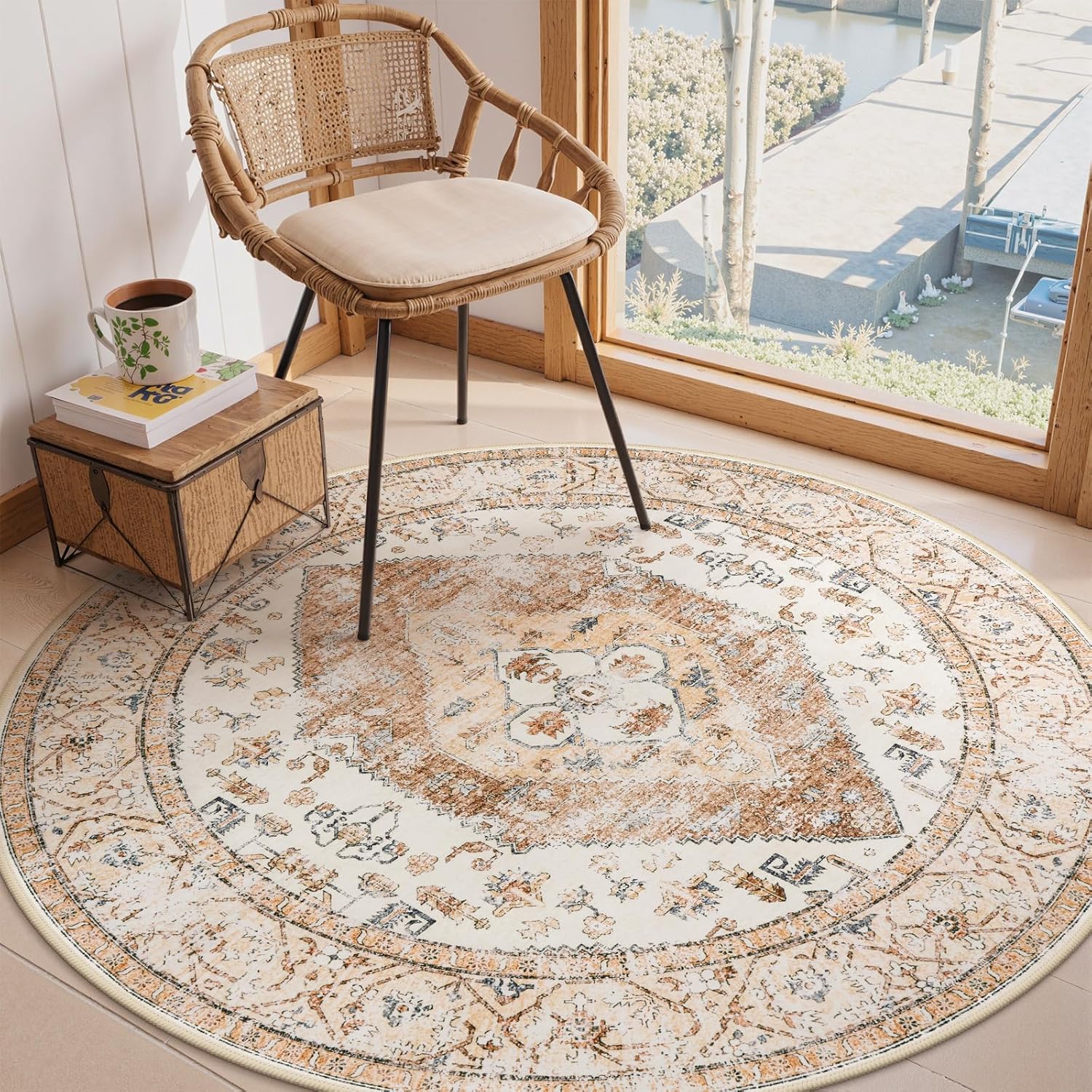 Lahome Boho Round Area Rug - 5Ft Machine Washable Round Bedroom Rugs Non-Slip Throw Large Round Rugs for Living Room, Oriental Distressed Print Circle Rugs for Office Dining Room Kitchen Classroom