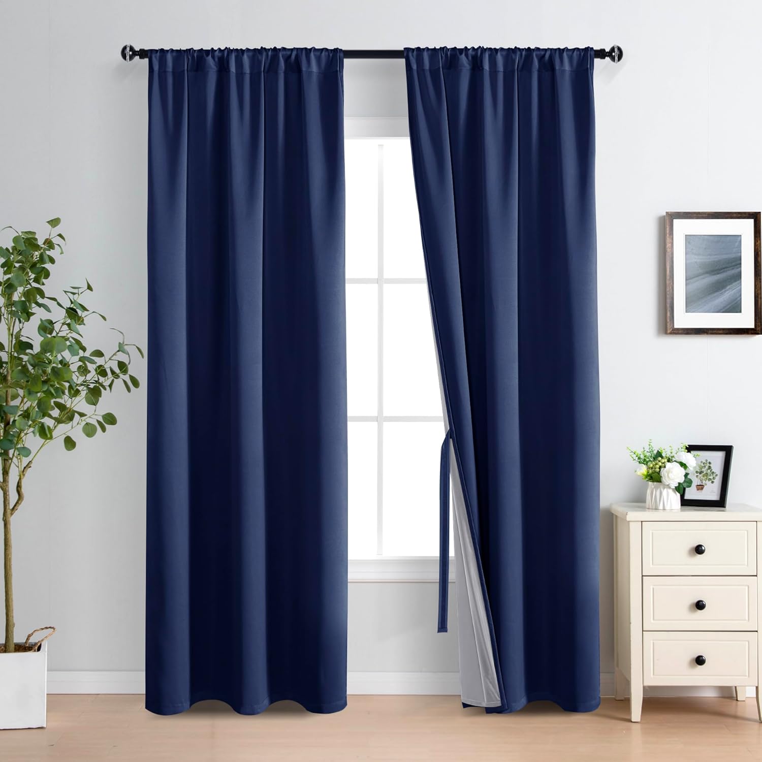 XWZO Full Shading Blackout Curtains 84 Inches Length with Tiebacks- Heat and Light Blocking Rod Pocket Window Drapes with Black Liner Backing for Bedroom/Kid's Room, Navy Blue, W42 x L84, Set of 2
