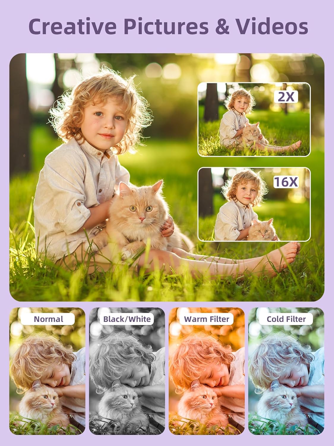 - SUPERIOR SUPPORT FOR THIS GIFT - Backed by a one year hassle-free promise- refund and replacement. Digital camera, SD card, lanyard, storage bag, batteries, adapter, cable, exquisite box..., contains everything you need. It is a perfect gift for boys, girls, teens on birthdays, Christmas or any important events, a first real camera for kids who love to take videos and pictures.