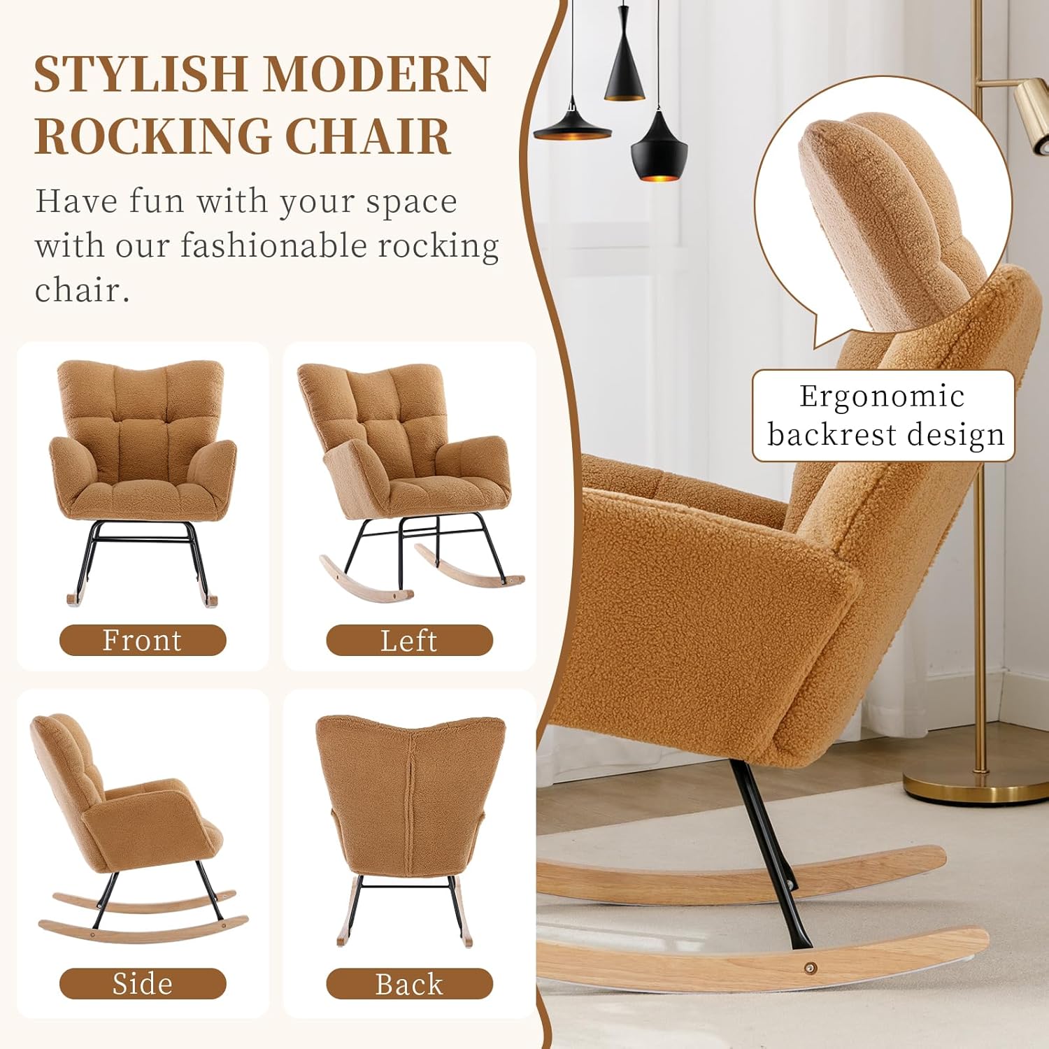 NIOIIKIT Nursery Rocking Chair Teddy Upholstered Glider Rocker Rocking Accent Chair Padded Seat with High Backrest Armchair Comfy Side Chair for Living Room Bedroom Offices (Kahaki Teddy)