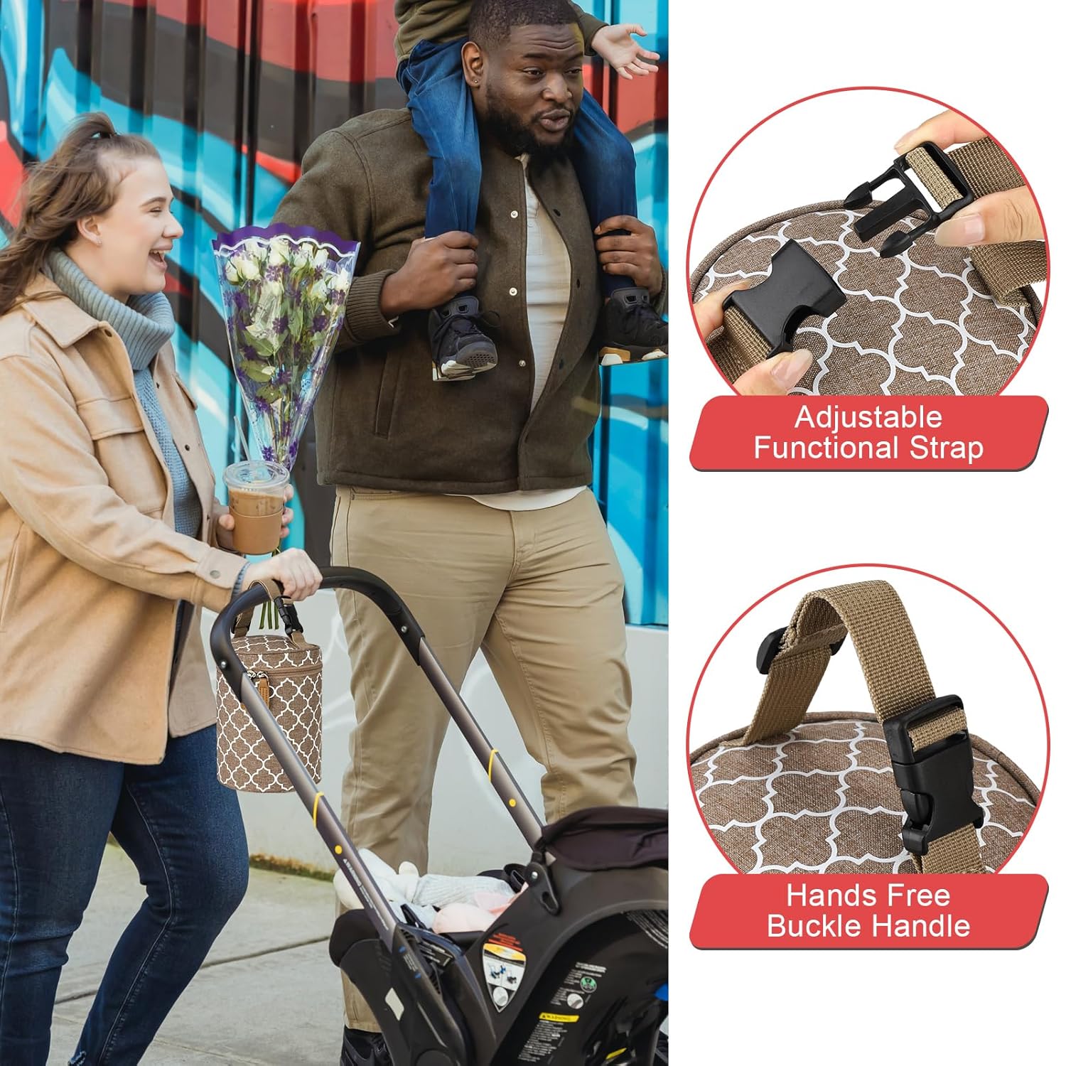- DETACHABLE BUCKLE DESIGN: The detachable buckle is designed for hanging on a baby stroller or car seat. Fits for any stroller or pet Stroller. You can also attach it to diaper bag, back seat of car, or take it as a small tote bag.