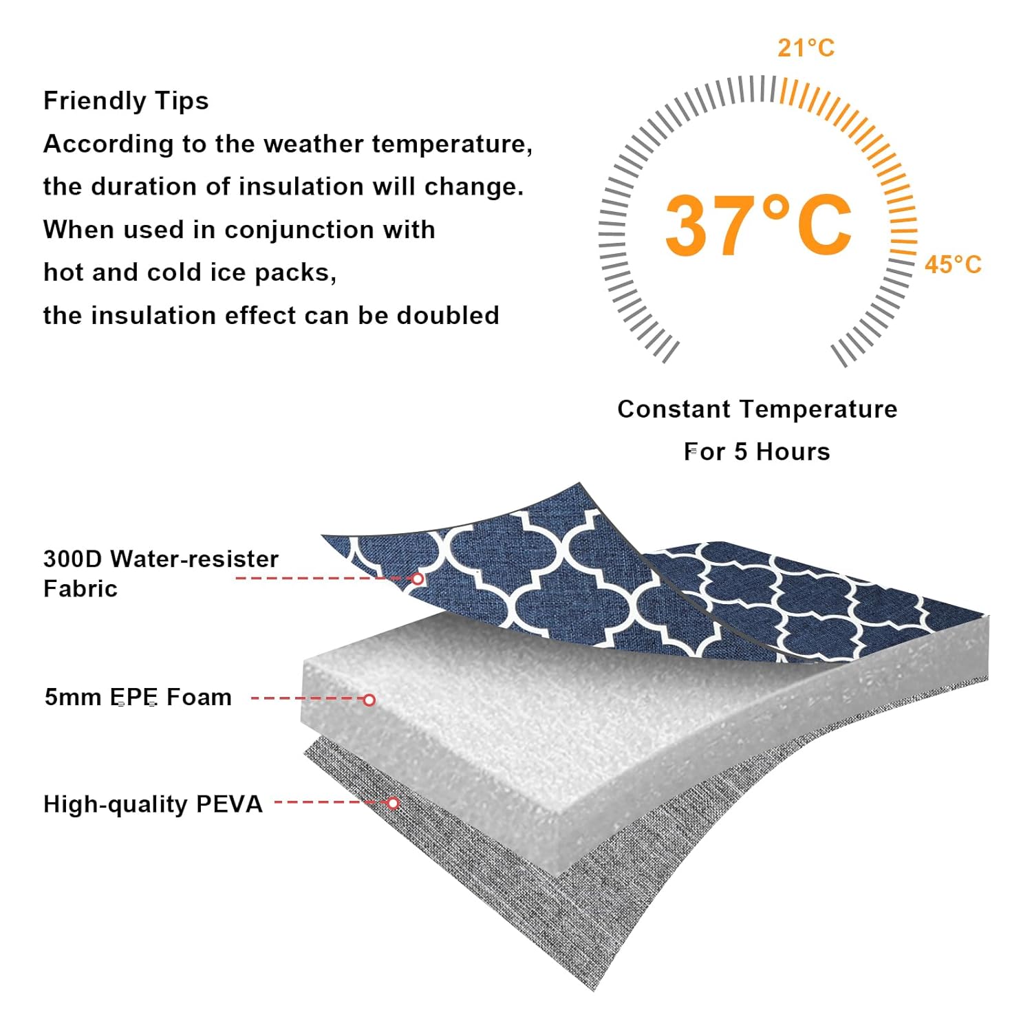 • HIGH QUALITY MATERIALS: This bottle cooler bag is made of high quality water-resistant 300D composite oxford fabric, 8mm extra-thick EPE foam and food-grade PEVA, non-toxic and food safe. Insulated lining can keep bottles cool or warm, it is a perfect breastmilk cooler tote bag for nursing mom.