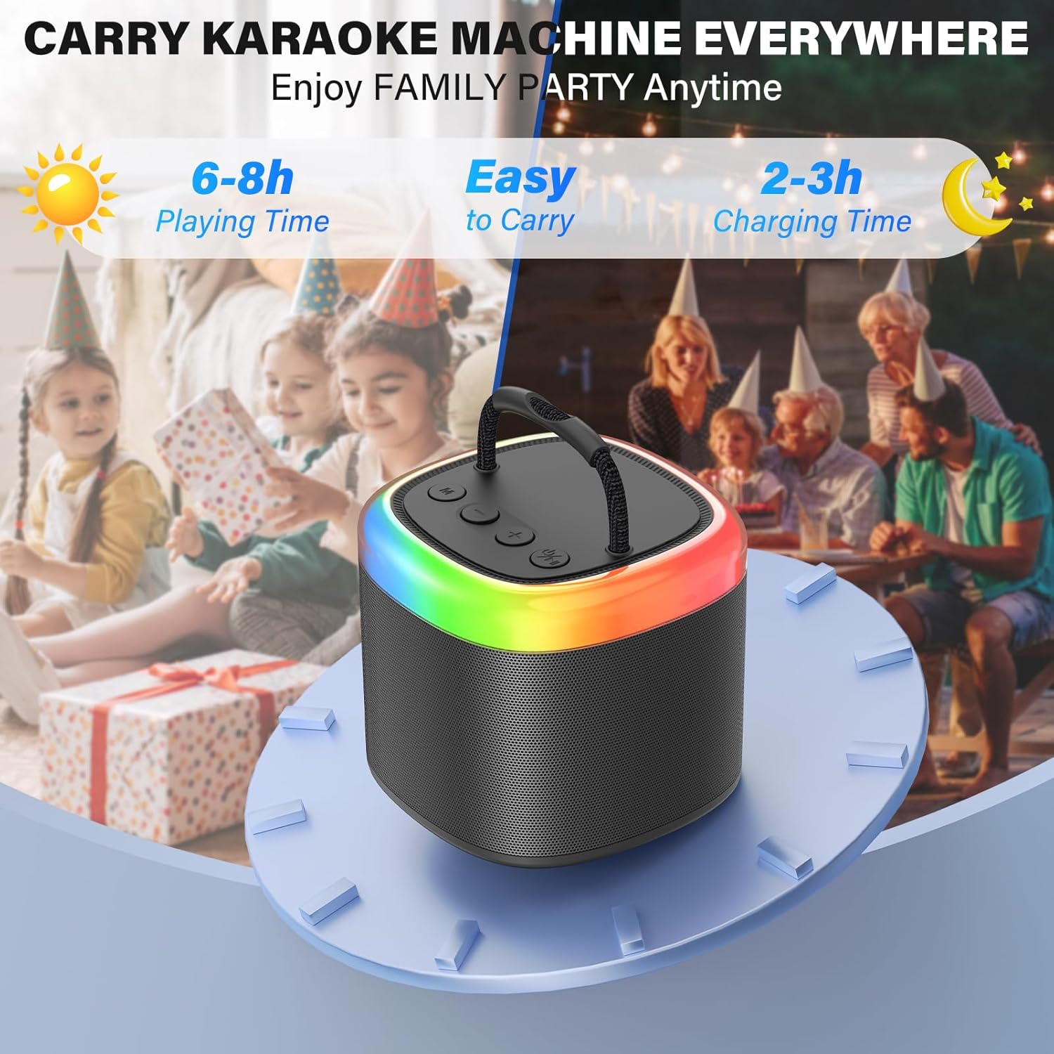 - Interactive Voice Effects & LED Party Lights - Engage everyone with four magic voice filters including monster and female tones, along with dynamic LED lights to create an electrifying party atmosphere.
