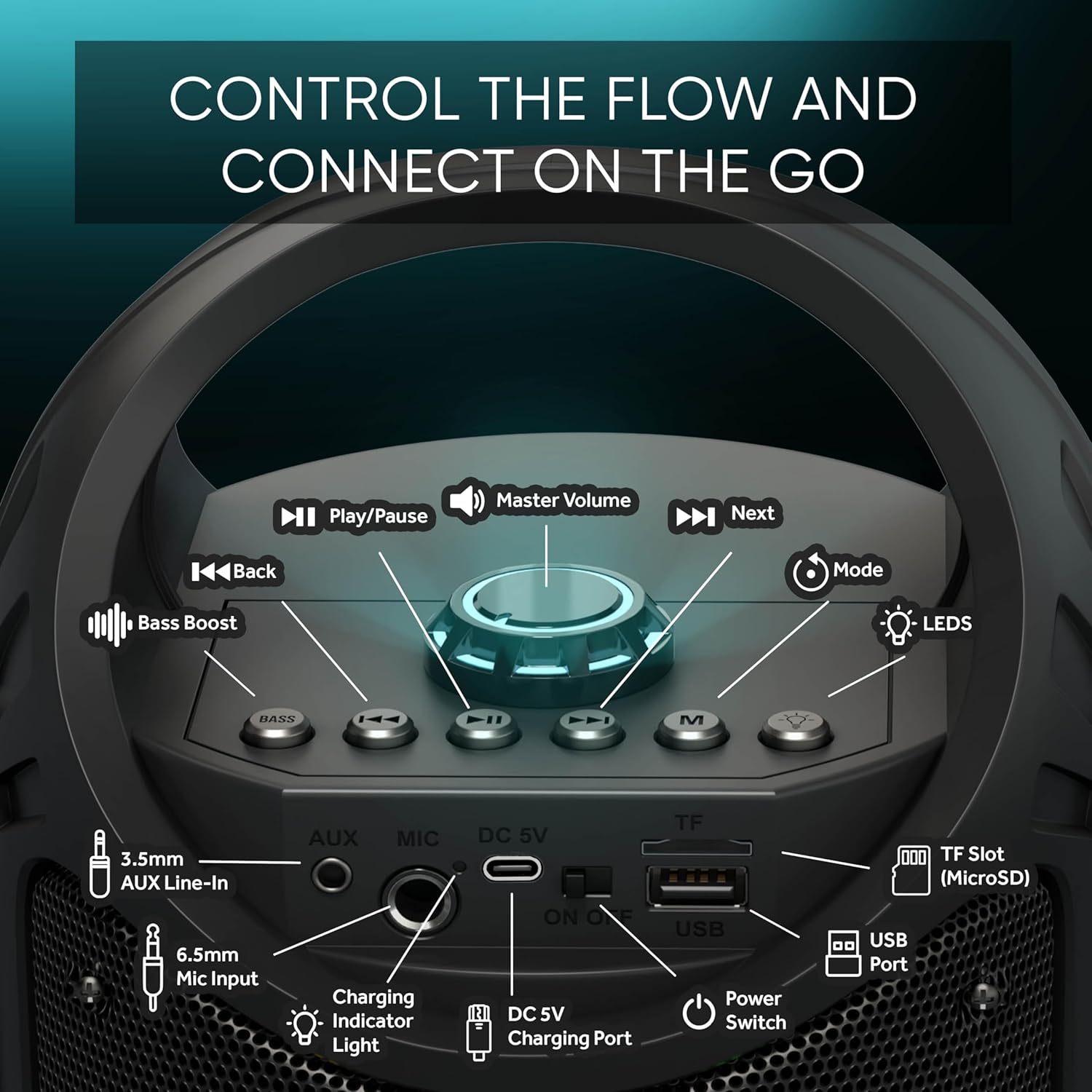 - 【Features Galore】 - 6 playback modes: Bluetooth, USB, AUX, FM radio, Micro-SD, or PA portable. Light up sound system features a color-shifting LED ring light. It’s a double dance and sing along with TWS; buy a second Burletta to pair your karaoke machines at the press of a button.