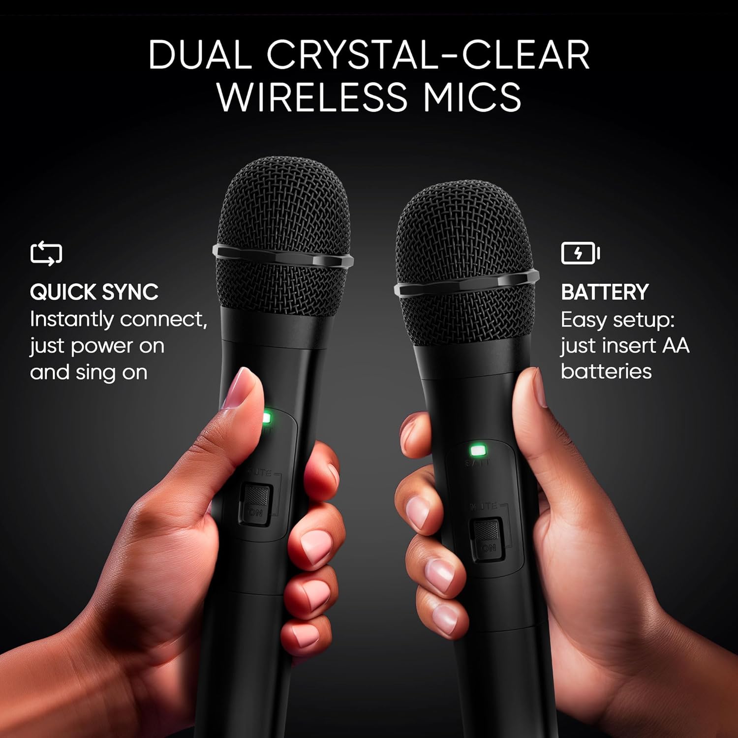 - 【Complete Karaoke Companion】 - Professional karaoke machine with all you need included! Your complete karaoke equipment features 2 wireless mics, a charging cable, a user manual, and a 60-day warranty. It’s all-systems-go for your sojourn to stardom.