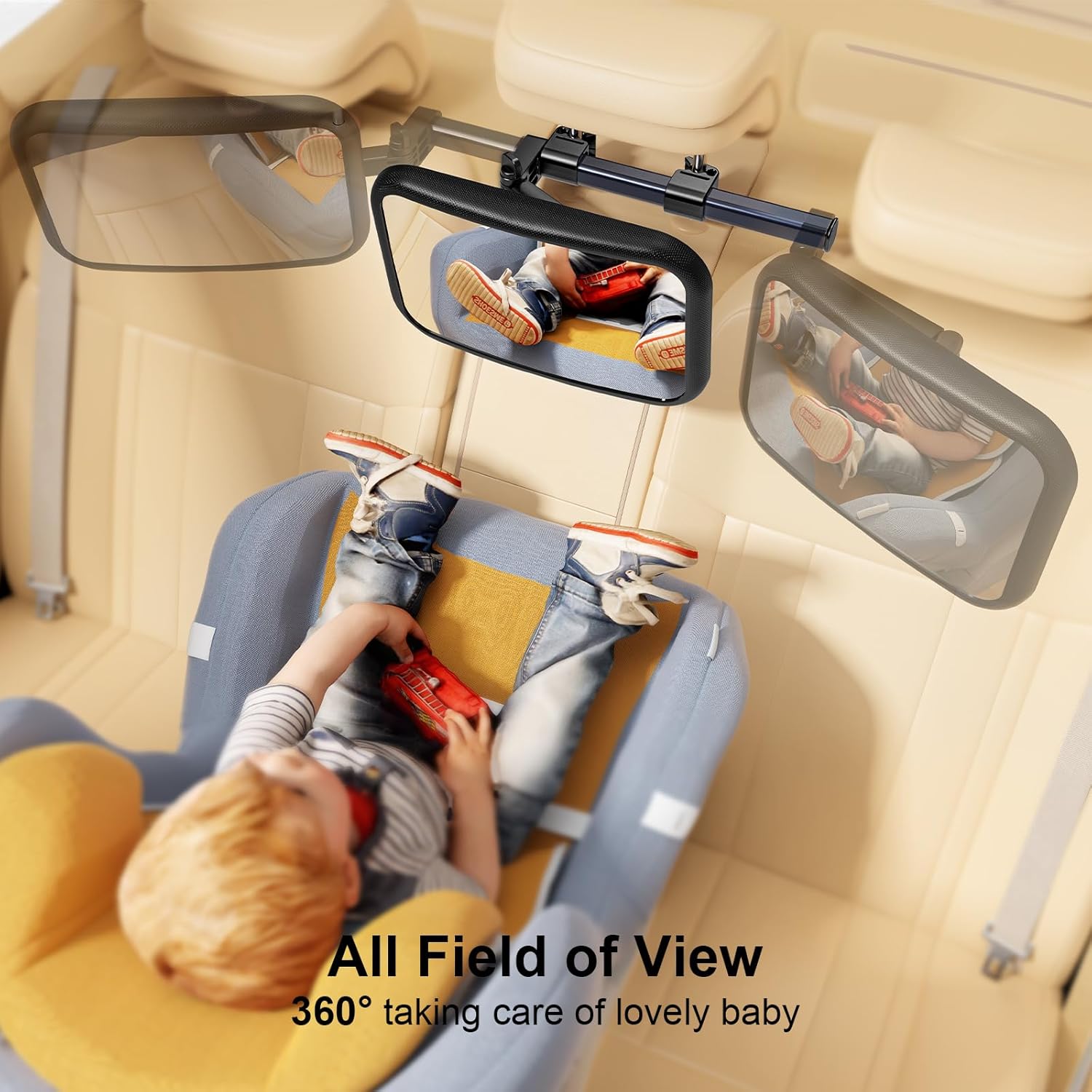 - [360° to See Baby] Our baby mirror allows you to see baby in any angles. Unlike traditional narrow single-view baby mirror, with a 180° adjustable arm and 360° rotatable ball, this baby mirror for car seat rear facing can be easily adjusted on any headrest, taking into account all aspects of the baby.