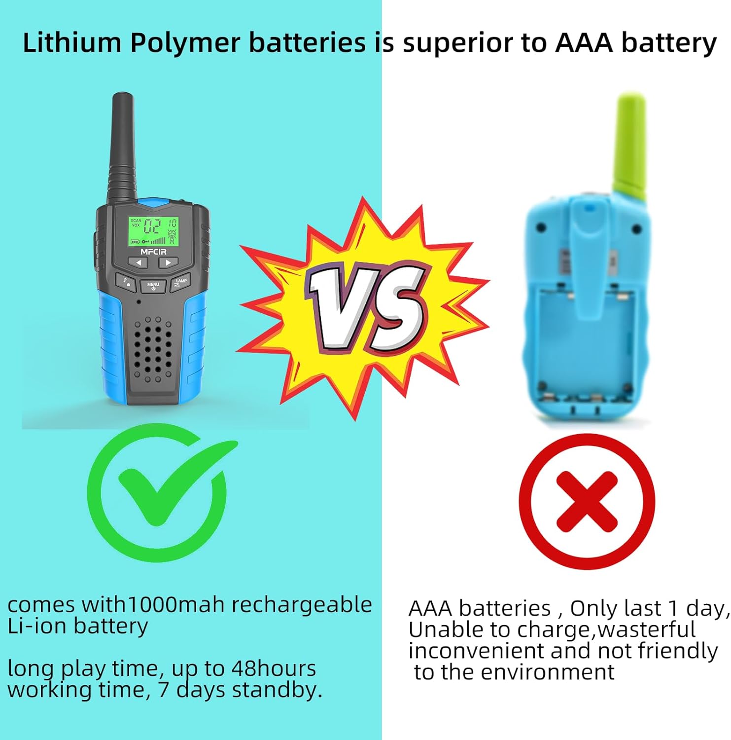 - Rechargeable Kids Walkie Talkies:The kids walkie talkies with a built-in 1000mAh polymer battery,No need to constantly buy and replace disposable batteries. providing a long working time of up to 48 hours and a standby time of 7 days, A full charge lasts a decent amount of playtime, and they recharge quickly.
