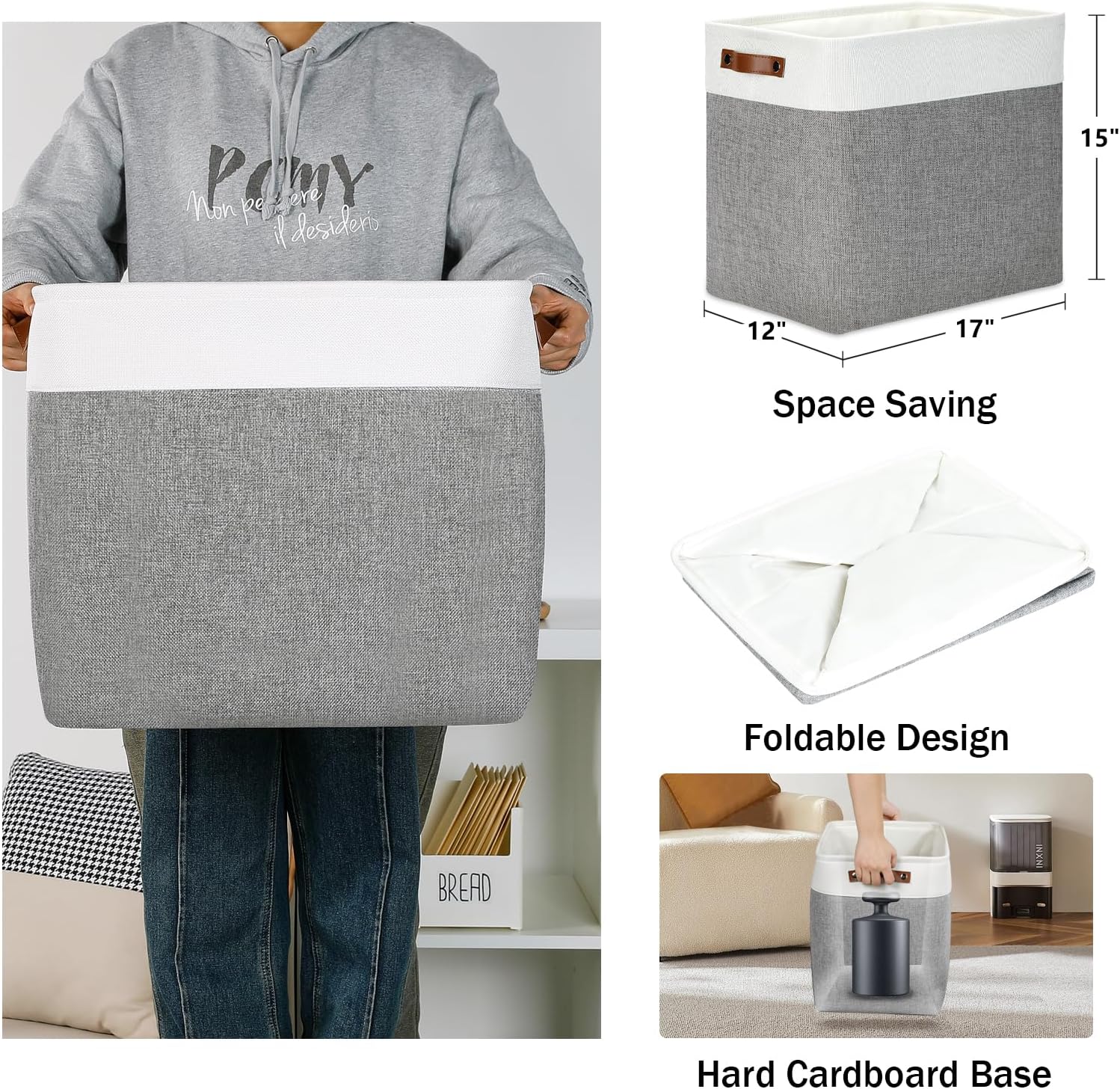 - 【Unique Design & Modern & Decorative】Set of 3 large storage baskets, dimensions(each): 17(L) x 12(W) x 15(H) inches. Collapsible storage baskets bring you organizing convenience and a sweet home. Great for socks, underwear, books, magazines, toys, baby clothes, pet products, wipes, towels, decorations, office supplies, DVDs, and gifts. The fabric baskets with neutral colors can match a lot of home styles - keeping your home nice and tidy.
