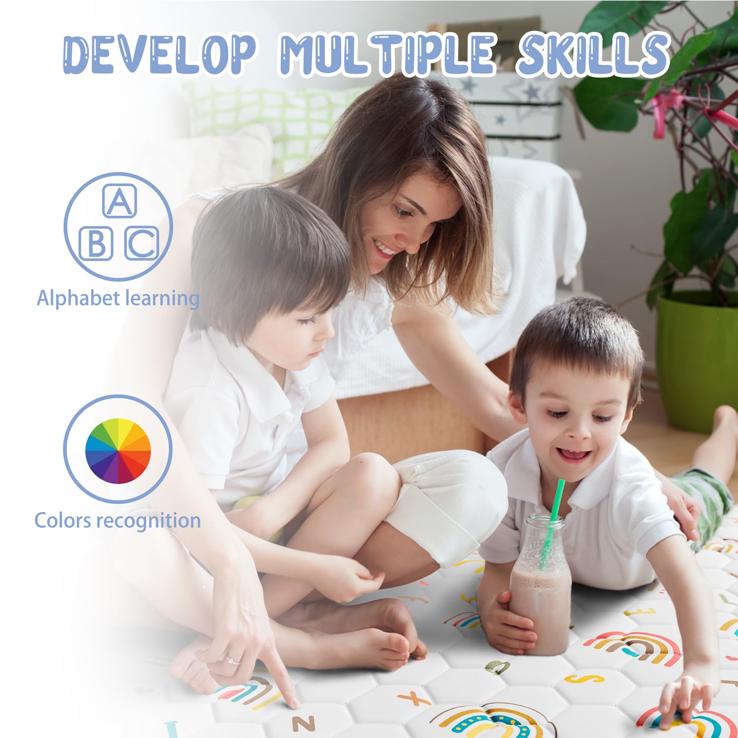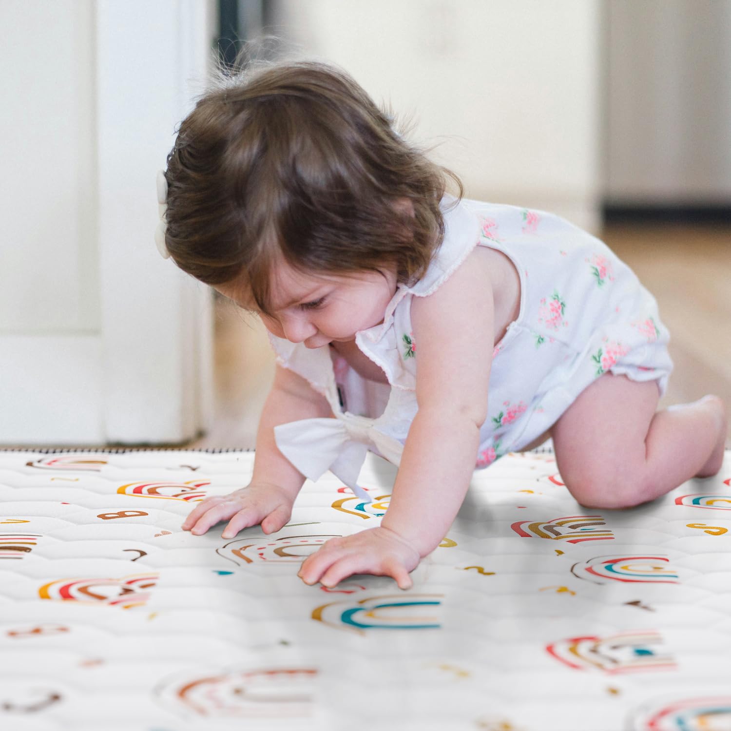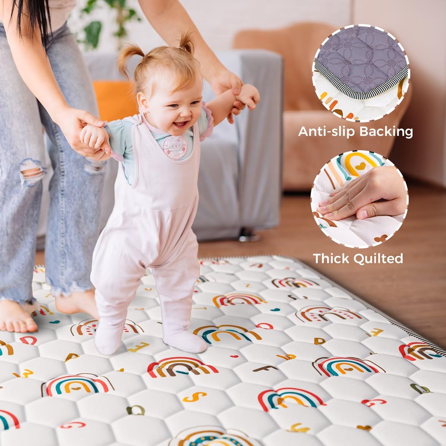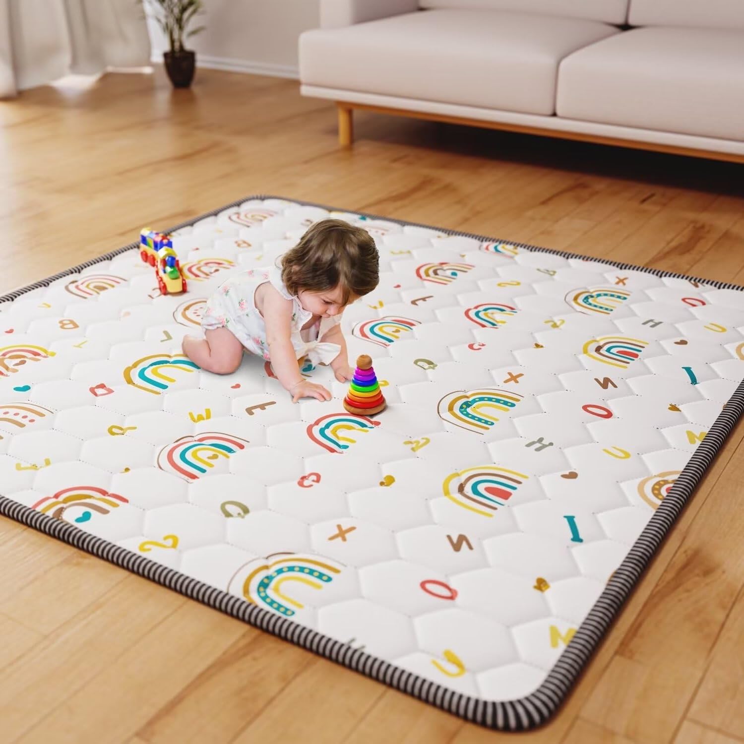 - 【Themed Design】The play mats for babies and toddlers designs with the unique boho rainbow pattern, matching colortful letters help improve children's cognitive skills. Cute floor mats for babies can make young children interested in exploring natural phenomena and help to stimulate their curiosity and imagination. you can use it in all sorts of infant activities, such as tummy time, crawling, learning to walk, playing and sleeping.