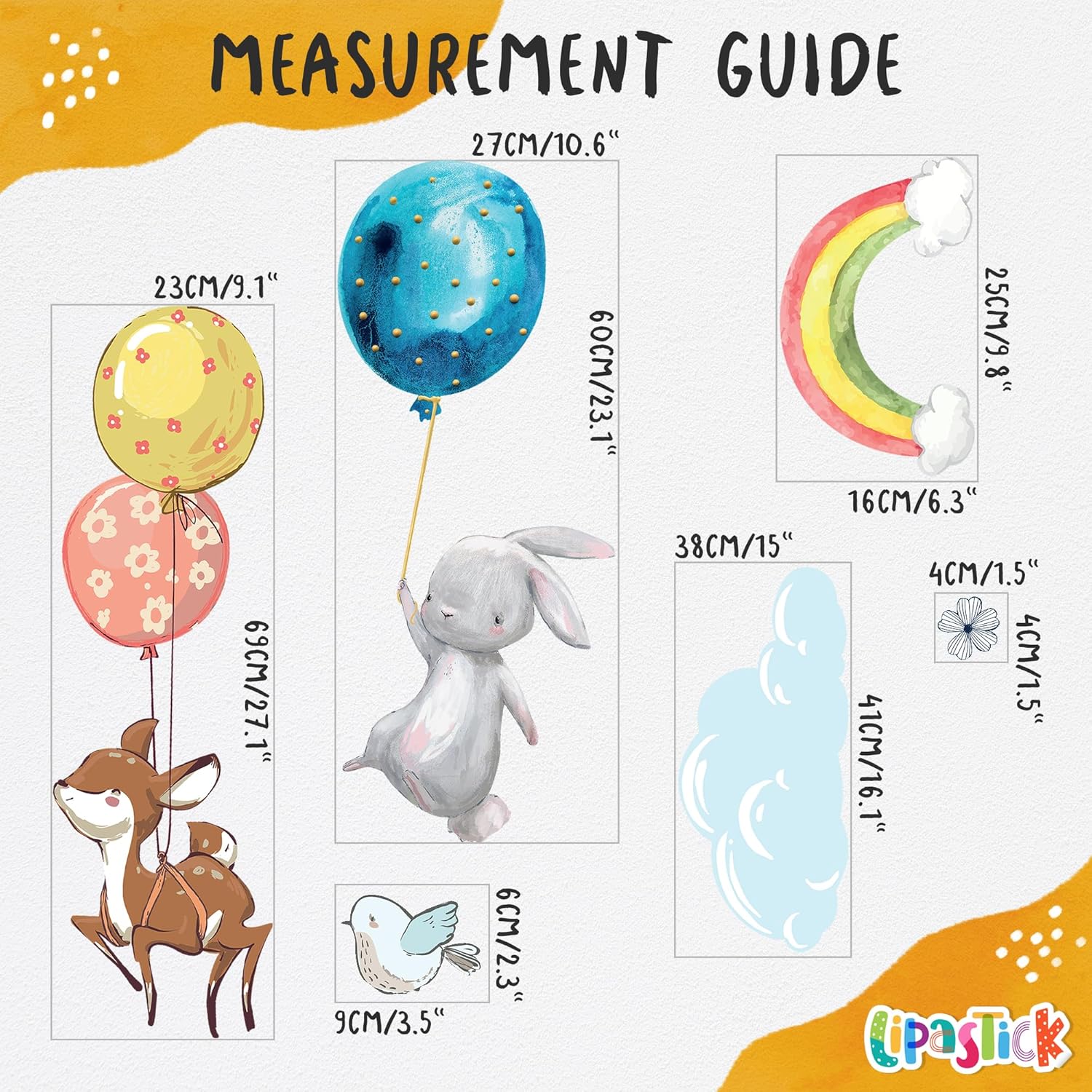 - 🎈 Package Content: Animal wall decals for baby room come in a pack of 3 sheets. Includes: hot air balloons, panda, bunnies, raccoon, koala, fox, birds, clouds, and butterflies. The sheet size is 47.2" x 16.7". This set of stickers is size XXL and its finished size is 156.2" x 48”. Perfect for covering full wall.