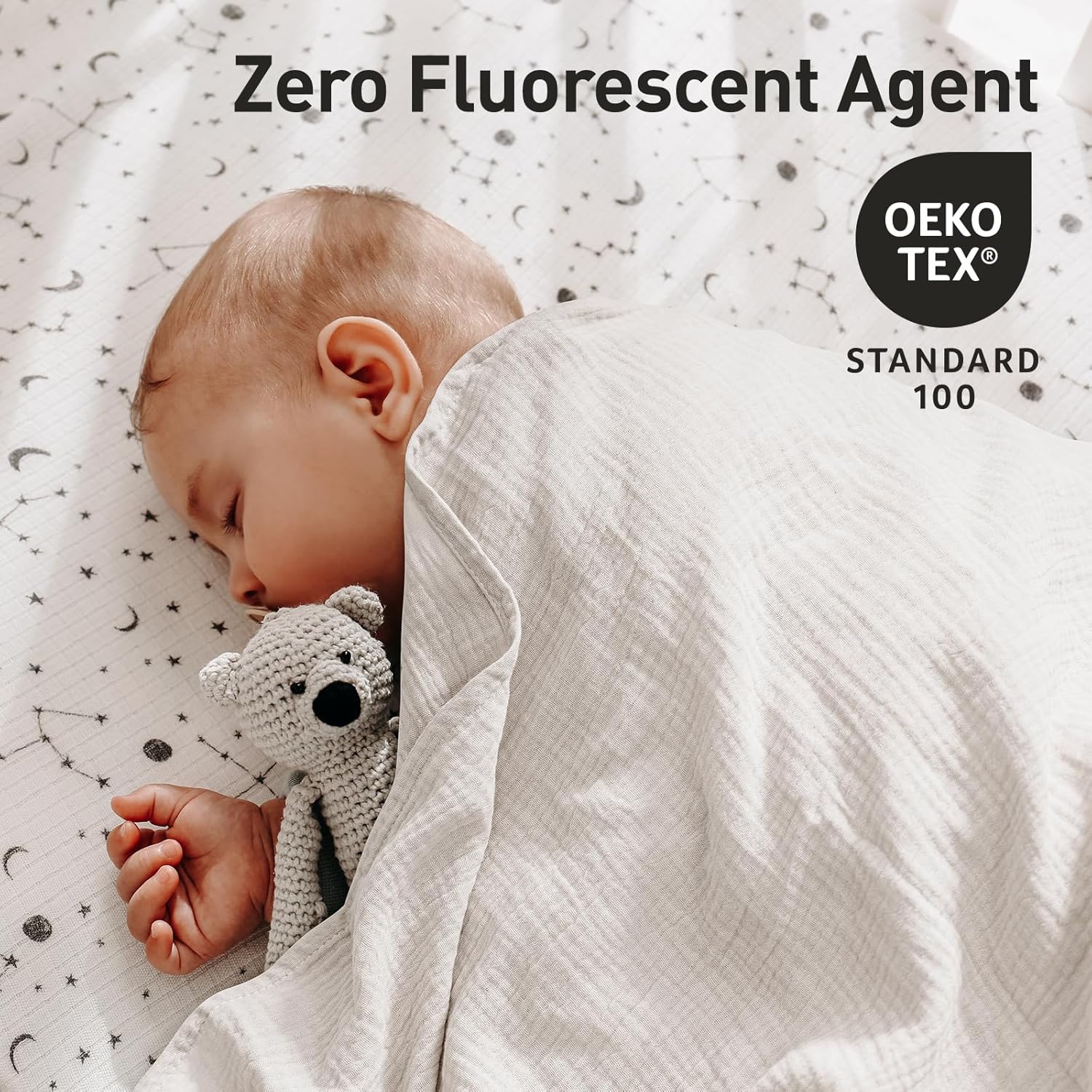 - SUITABLE SIZE: All of our products have passed the OEKO-TEX STANDARD 100 certification.Our muslin baby blanket measures 38'' x 40''(95 x 100 cm; material is approximately ± 1 inch), which is large enough to easily wrap or swaddle babies from startling themselves awake with random arm movements, recreates the secure and cozy feeling of the womb, helping soothe your baby and enabling them to sleep better