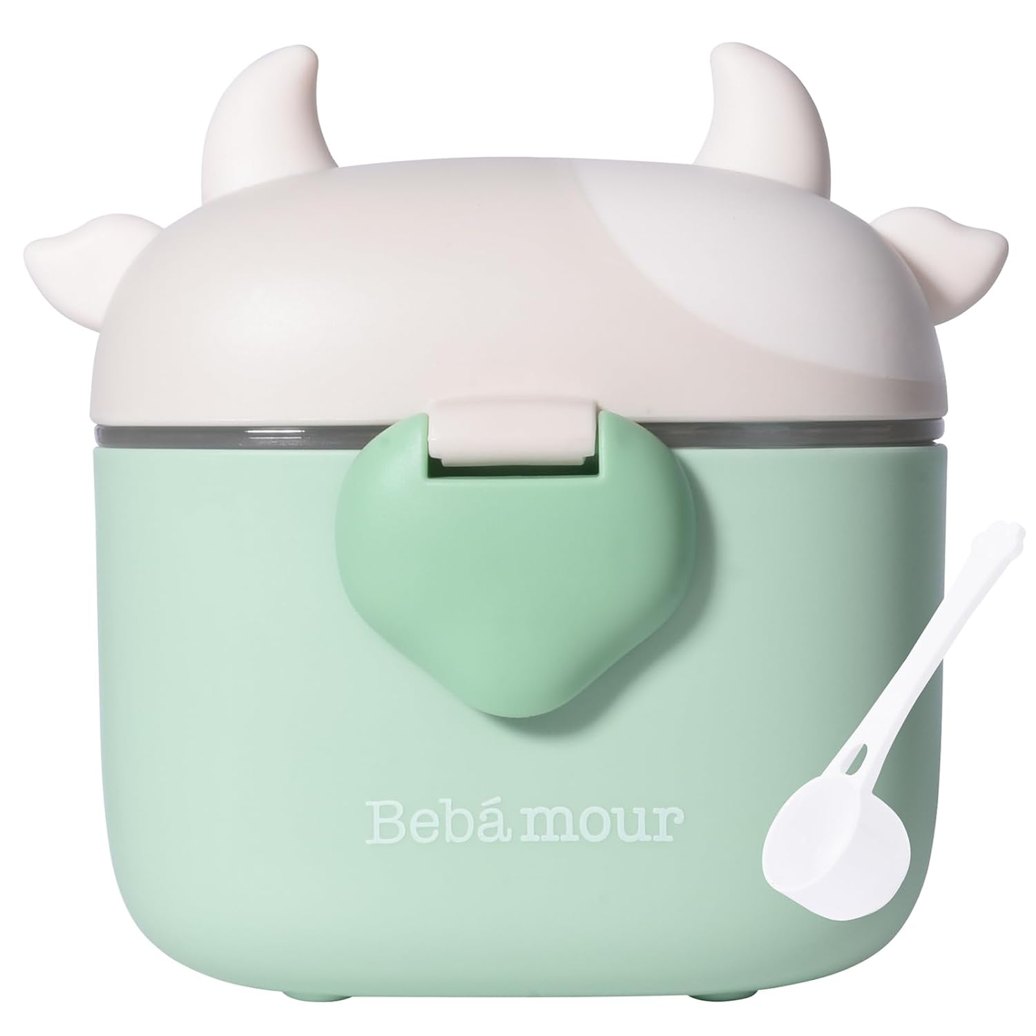 Bebamour Baby Formula Dispenser On The Go, Formula Container to Go, Formula Holder for Travel, Candy Fruit Snack Storage Container with Scoop and Leveller (Light Green Cow)