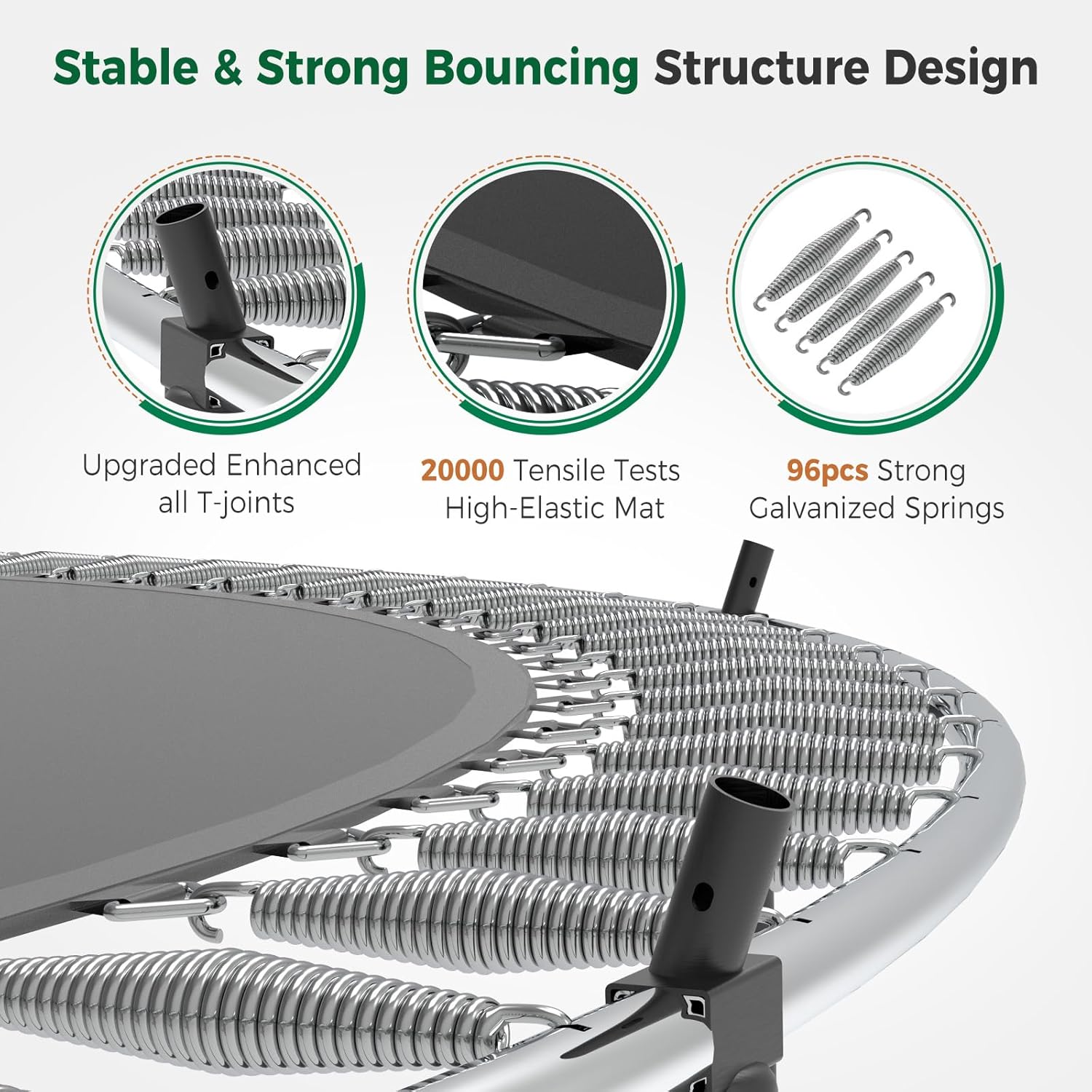 - 【Premium Bouncing Experience】This Tatub large trampoline is supported by 96 robust springs, guaranteeing stability with every bounce. Its heavy-gauge galvanized steel frame forms 6 W-shaped legs with bars, providing a solid foundation for the jumping zone