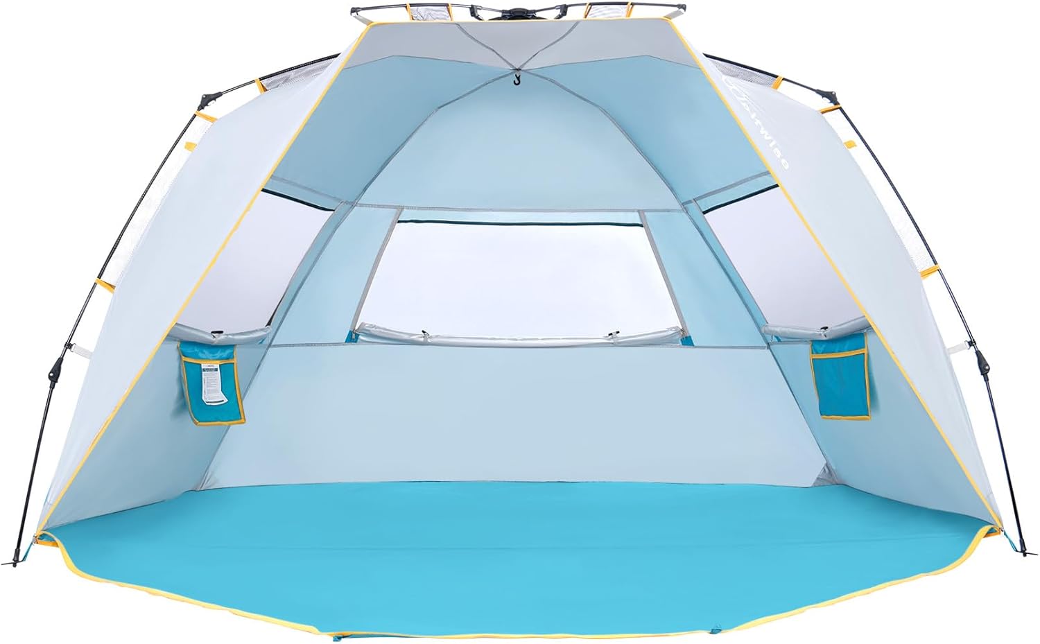 - Easy Setup & Super Stable: The specially designed spring opening system shows an industry-leading level of improvement. One person can set up the beach tent easily in seconds. Compared to the drawstring design, this one is faster, effortless, and saves more time. The 8.5 mm thick fiberglass poles make the tent stronger. Equipped with 3 sandbags, 4 wind ropes and 10 stakes to ensure stability and prevent it from being blown away in the wind.