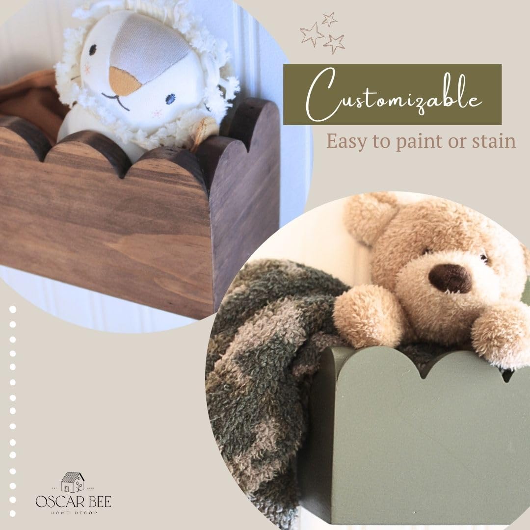 - 𝗖𝘂𝘀𝘁𝗼𝗺𝗶𝘇𝗲 𝘁𝗼 𝗬𝗼𝘂𝗿 𝗡𝘂𝗿𝘀𝗲𝗿𝘆: Featuring a reversible scalloped design, this kids wall bookshelf fits perfectly in baby rooms, whether as traditional nursery shelves for wall or floating book shelves for wall nursery. Easily customize for girls room shelves, nursery bookshelf wall, or shelves for nursery girl or boy themes