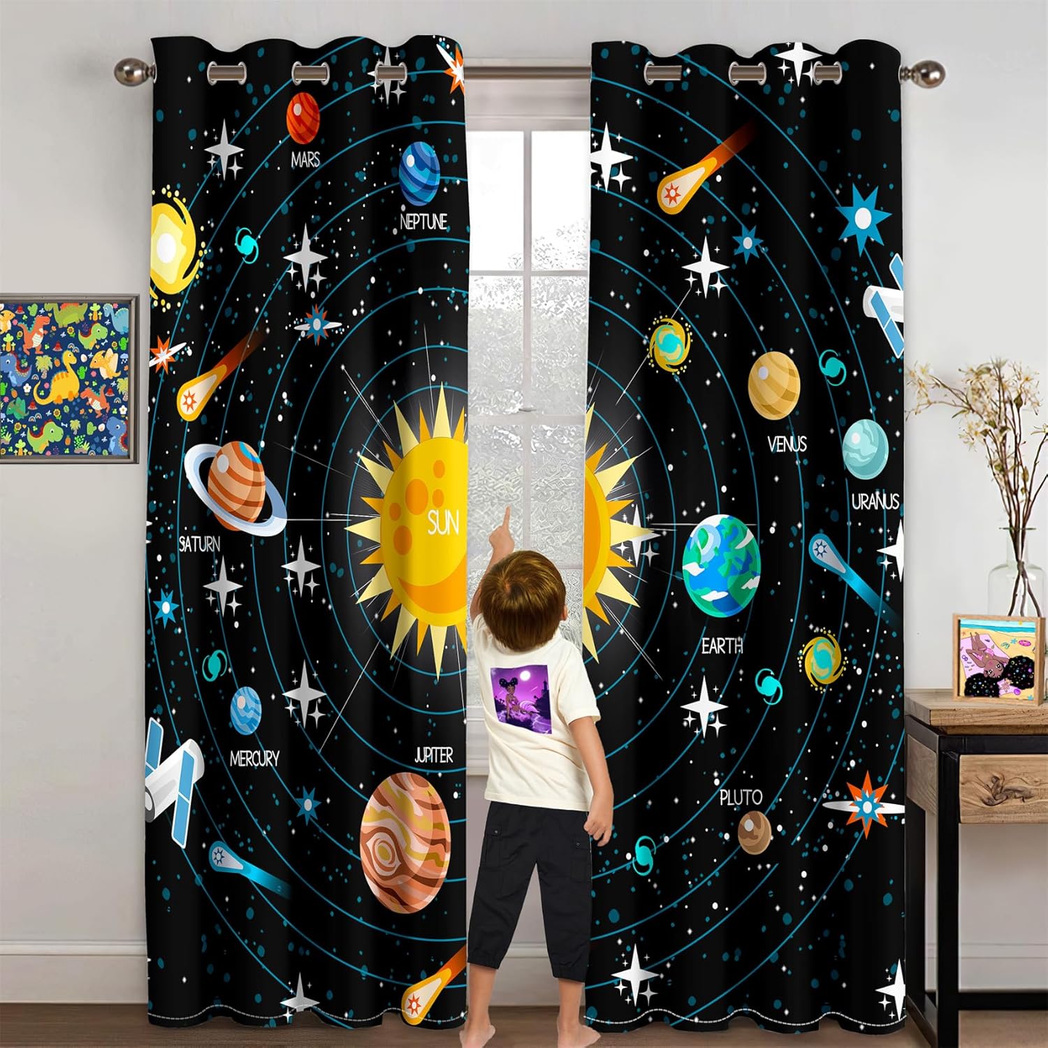 Outer Space Curtains for Boys - 2Pcs Solar System Print Curtain Panels for Boys Bedroom Planets Galaxy 95% Blackout Grommet Top Window Drapes for Living Room, 82" x 84"