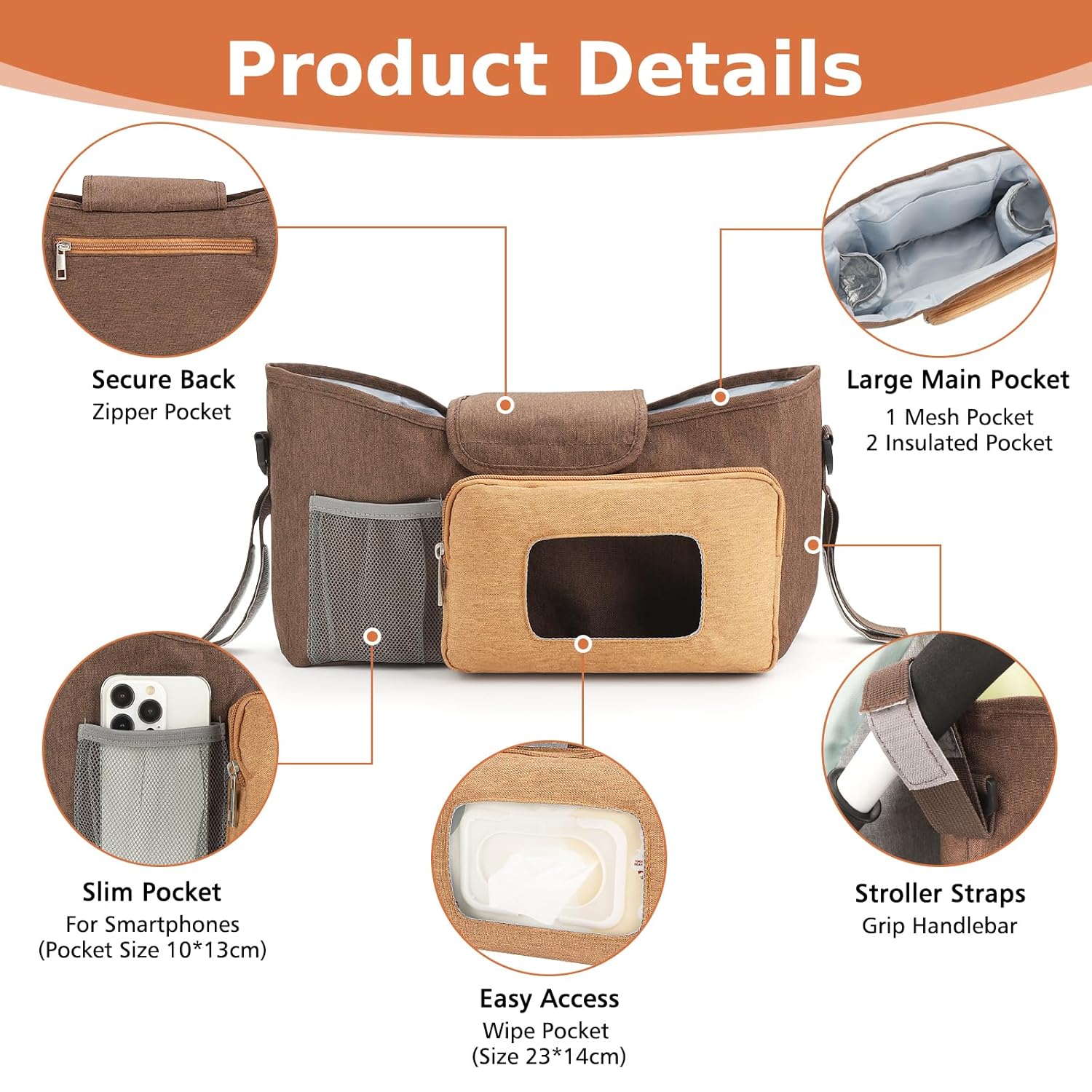 - Two Usage Methods : It can be hung as a stroller organizer on the stroller. When you don't need to use a stroller, you can also install the accompanying strap and carry this storage bag for easy outing.