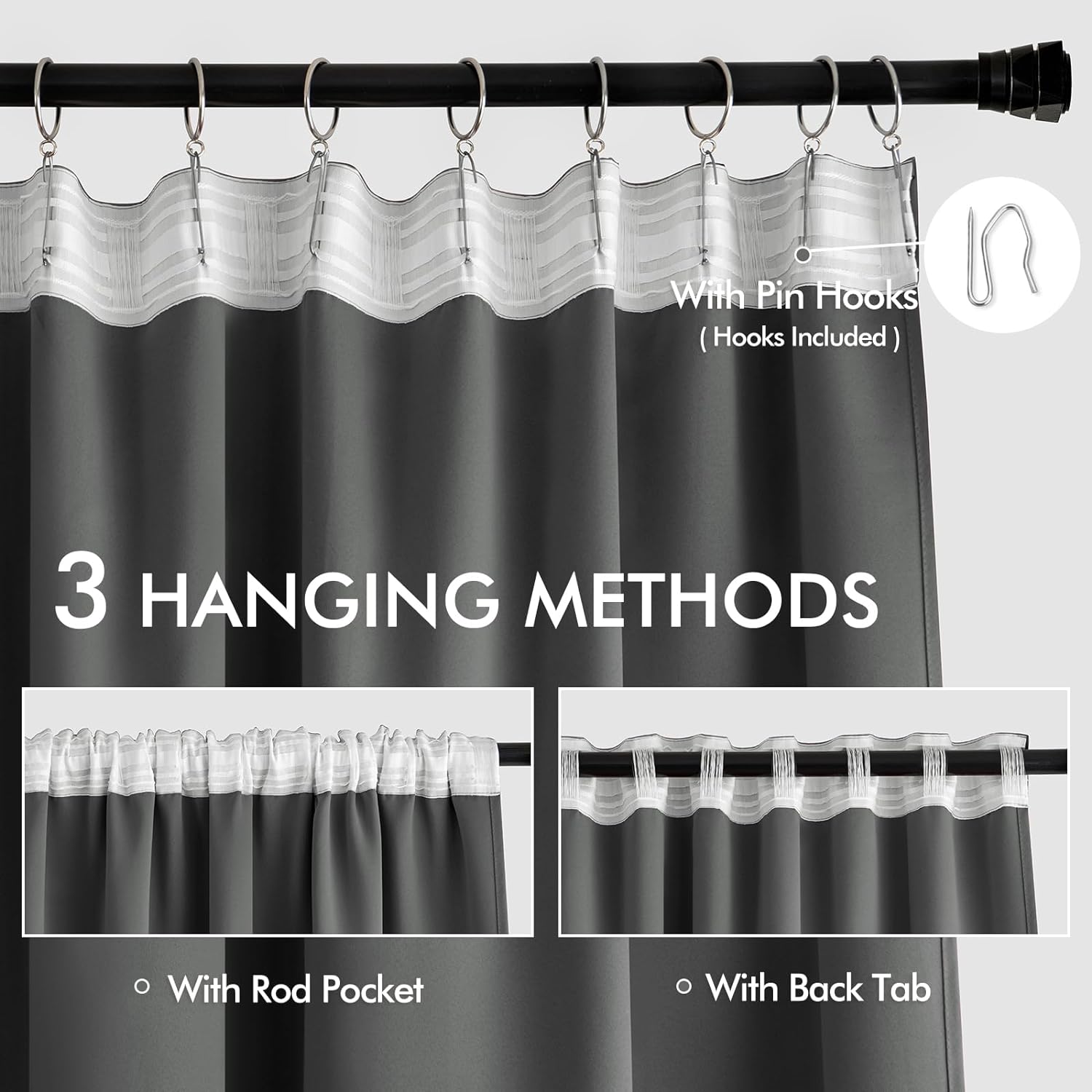 - MULTIPLE HANGING OPTIONS: Each panel features a 3-in-1 top style design: Rod Pocket, Back Tab and Pinch Pleat. The Back loop (2.3 "long) and rod pocket (3.1" long) fit most standard rods. Curtains also can be hung with clip rings or different type of hooks. We will GIVE AWAY 20 PIN HOOKS for each pair of curtains for your convenience (rings won't be included). PLEASE NOTE THAT FOR THE PLEAT HANGING METHOD, VISIBLE PLEATS CAN ONLY BE ACHIEVED BY USING 4 PRONG HOOKS, AND WE ONLY PROVIDE PIN HOOKS.