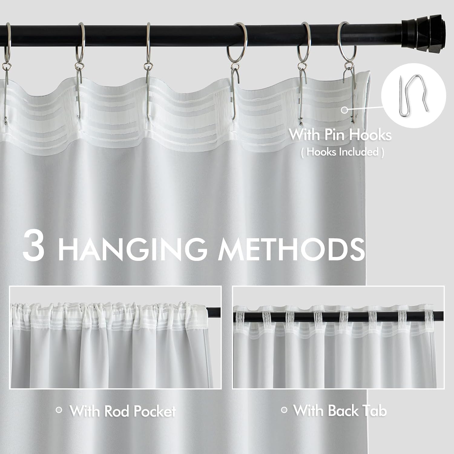 - MULTIPLE HANGING OPTIONS: Each panel features a 3-in-1 top style design: Rod Pocket, Back Tab and Pinch Pleat. The Back loop (2.3 "long) and rod pocket (3.1" long) fit most standard rods. Curtains also can be hung with clip rings or different type of hooks. We will GIVE AWAY 20 PIN HOOKS for each pair of curtains for your convenience (rings won't be included). PLEASE NOTE THAT FOR THE PLEAT HANGING METHOD, VISIBLE PLEATS CAN ONLY BE ACHIEVED BY USING 4 PRONG HOOKS, AND WE ONLY PROVIDE PIN HOOKS.
