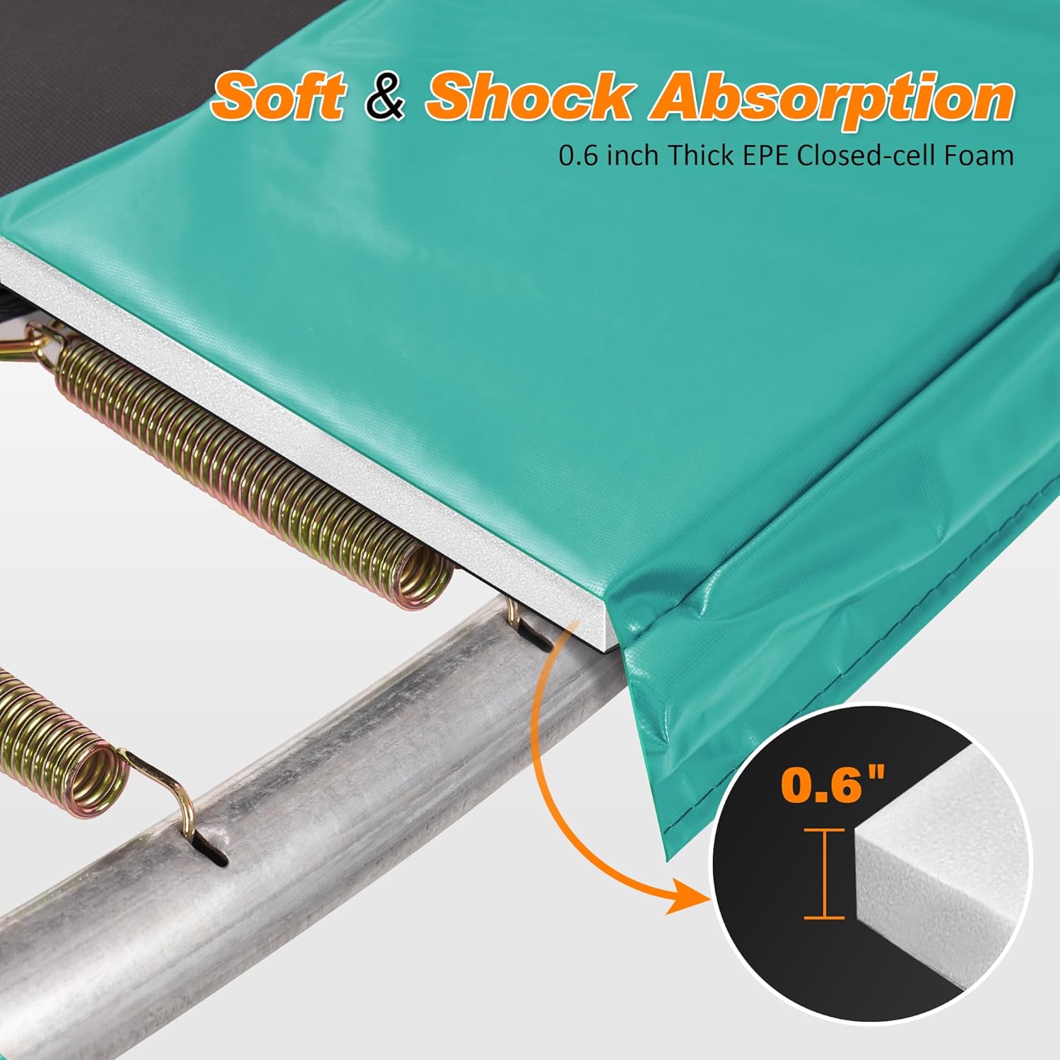 - Foam Padded, Safety & Shock Absorption: 0.6-inch thick EPE closed-cell foam inside, which helps to absorb the impact of a fall, ensuring that you enjoy a safe and sturdy jumping experience. In addition, the spring cover pad also provides you with a cozy resting space