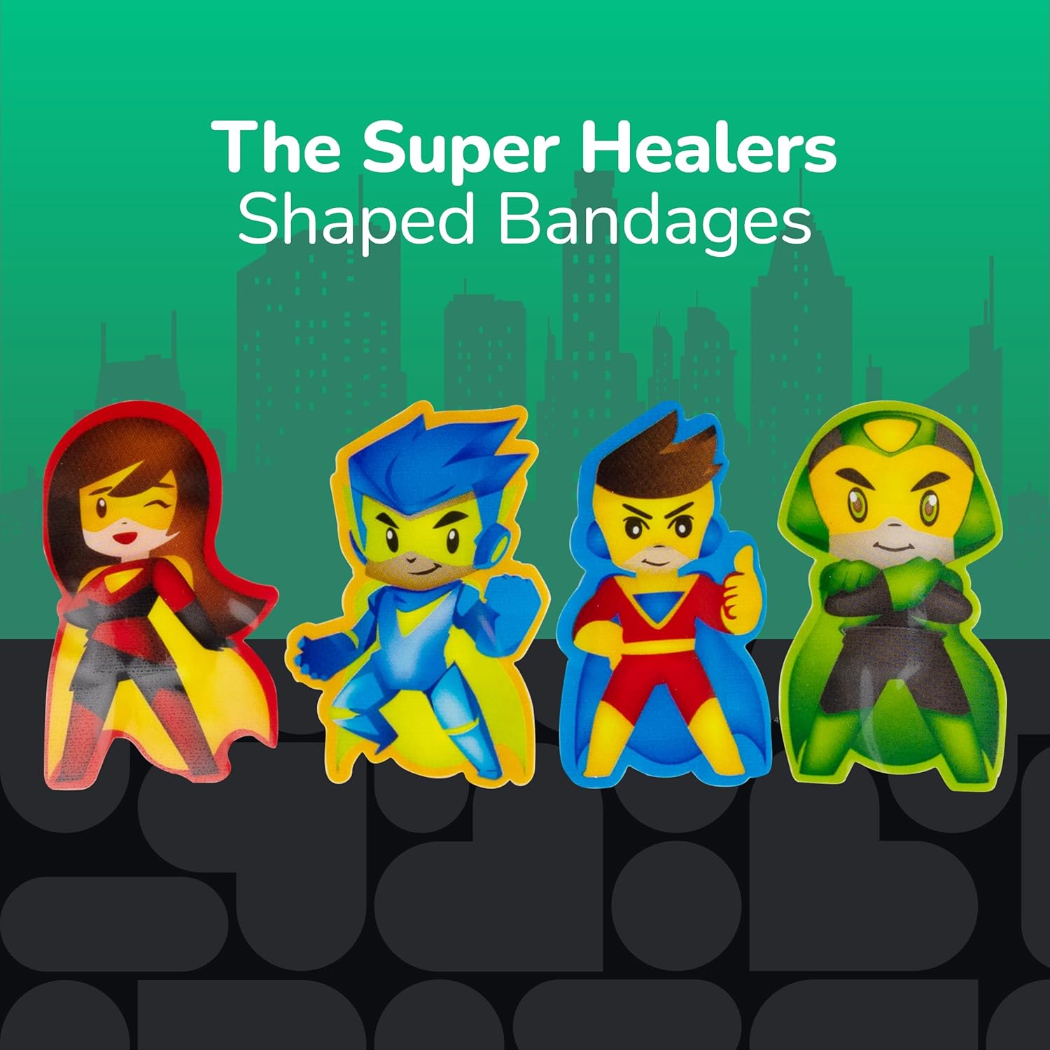 - SUPERHEROES BANDAGES: This 24 piece pack of Super Healers bandages feature fun Blue Cyprus, Red Amber, Green Onyx, and Yellow Falcon superhero shapes, and is great for putting a smile on kids' faces while protecting wounds such as cuts, scrapes, and burns; great for an epic first aid adventure, these sticky bandages come in a cute cardboard box and are perfect for kids and adults alike, and also for school nurses and pediatric doctors