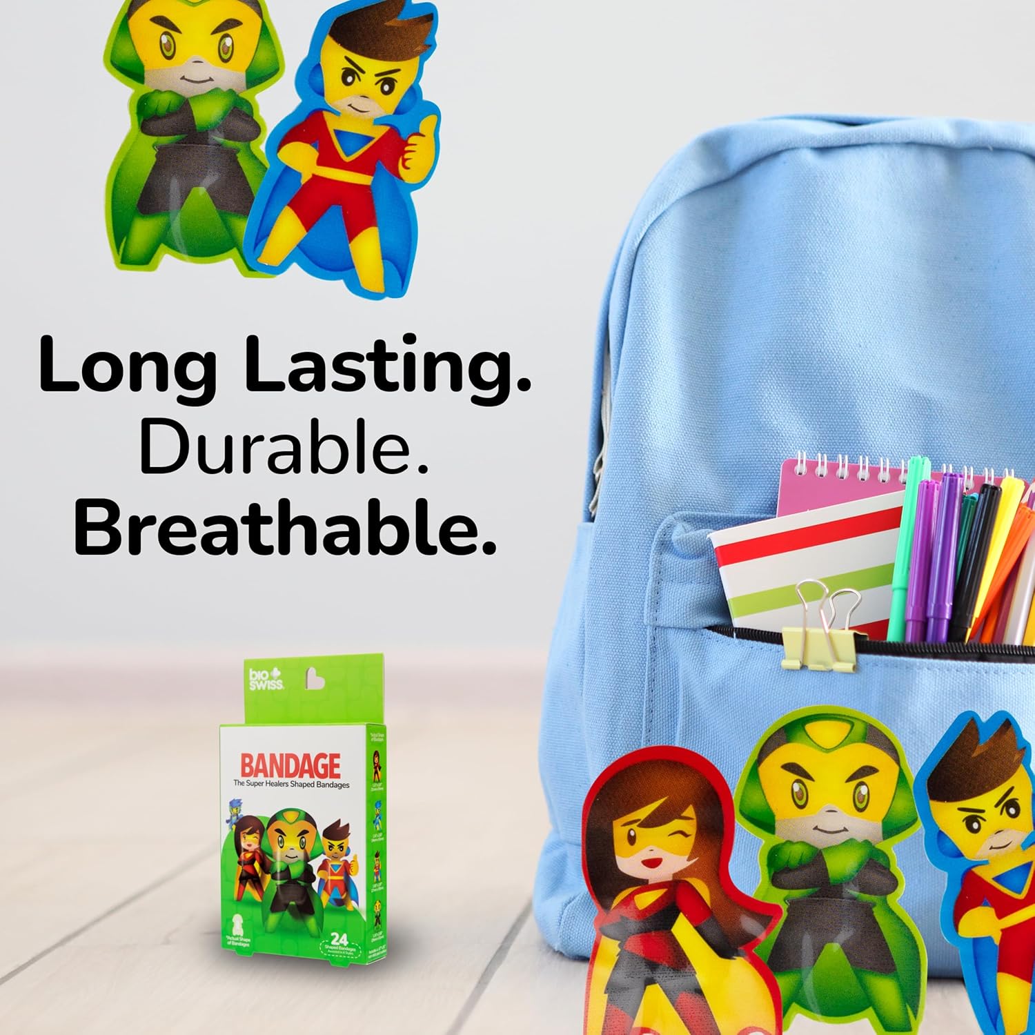 BioSwiss Bandages, Super Healers Superhero Shaped Self Adhesive Bandage, Latex Free Sterile Wound Care, Fun First Aid Kit Supplies for Kids and Adults, 24 Count
