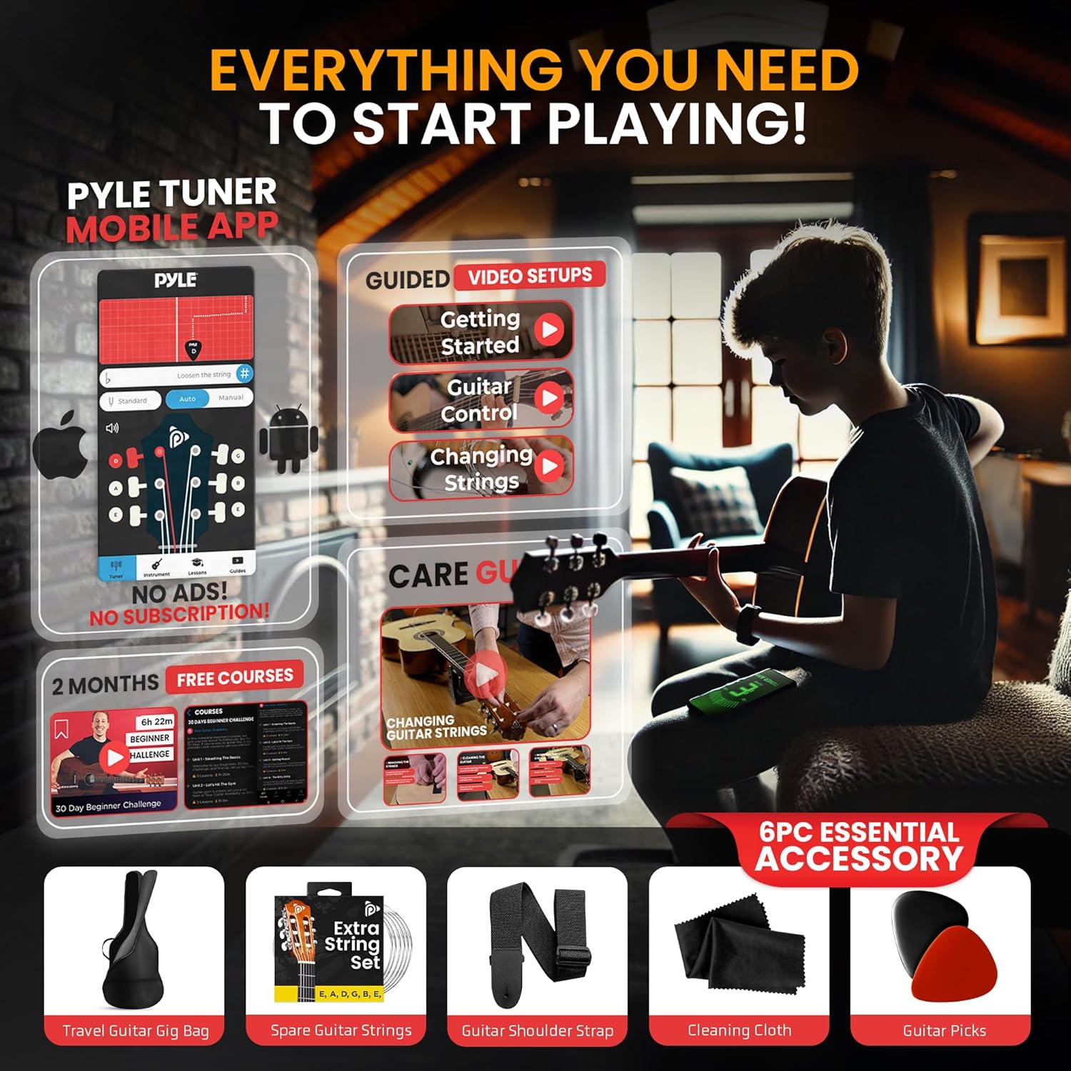 - 30” BEGINNER GUITAR SET: Pyle brings you a complete all-in-one acoustic guitar set, everything you need to start playing. The guitar comes with a gig bag case, spare strings, pearloid picks, cleaning cloth, and a gift card
