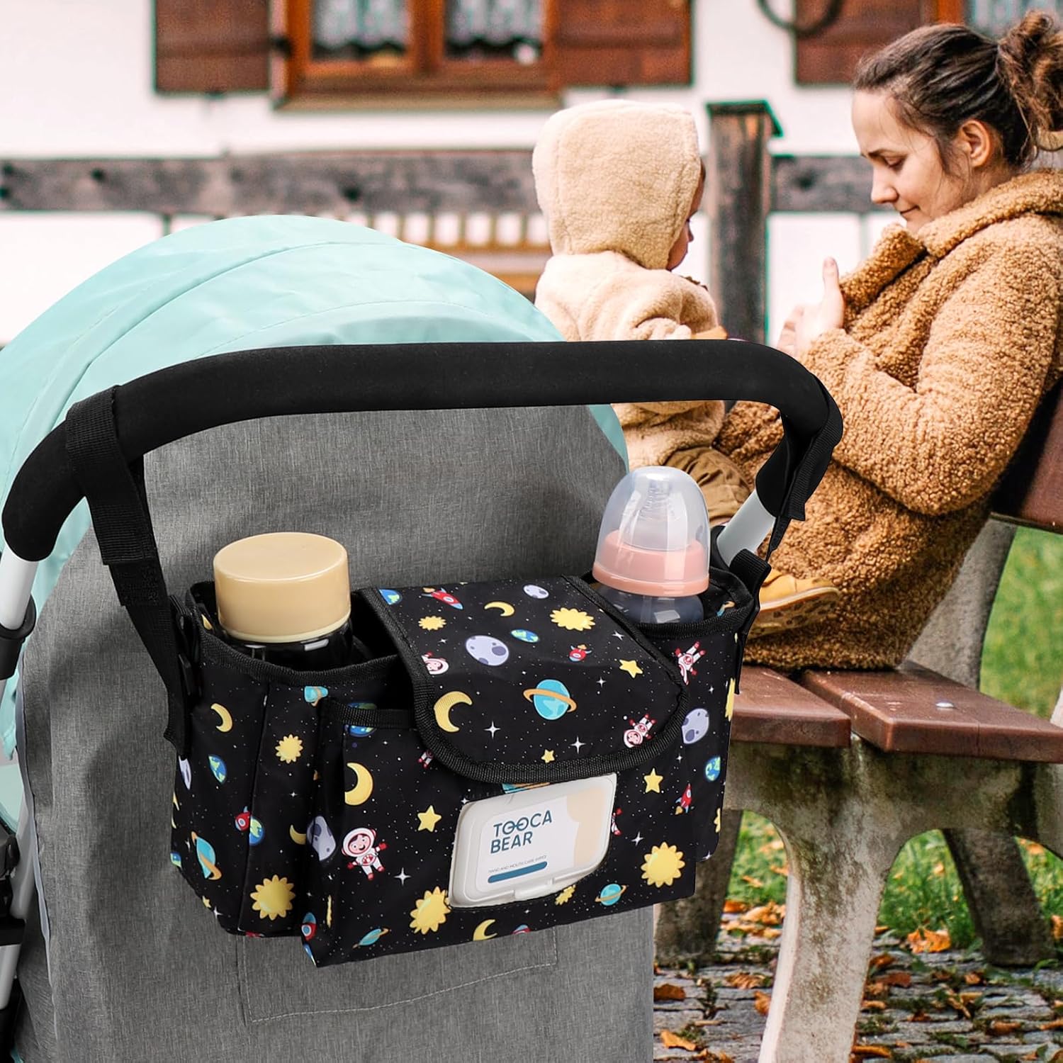 - Structured Stroller Organizer: This stroller caddy features an internal partition system that provides multifunctional compartments for efficient organization. The middle large storage compartment can storage baby diapers, toys, clothes, pacifiers or other accessories; 2 insulated cup holders on two sides, can be used to place baby bottles, beverage cups, water bottles etc. A convenient open pocket on the front for easy access to wet wipes or tissue.