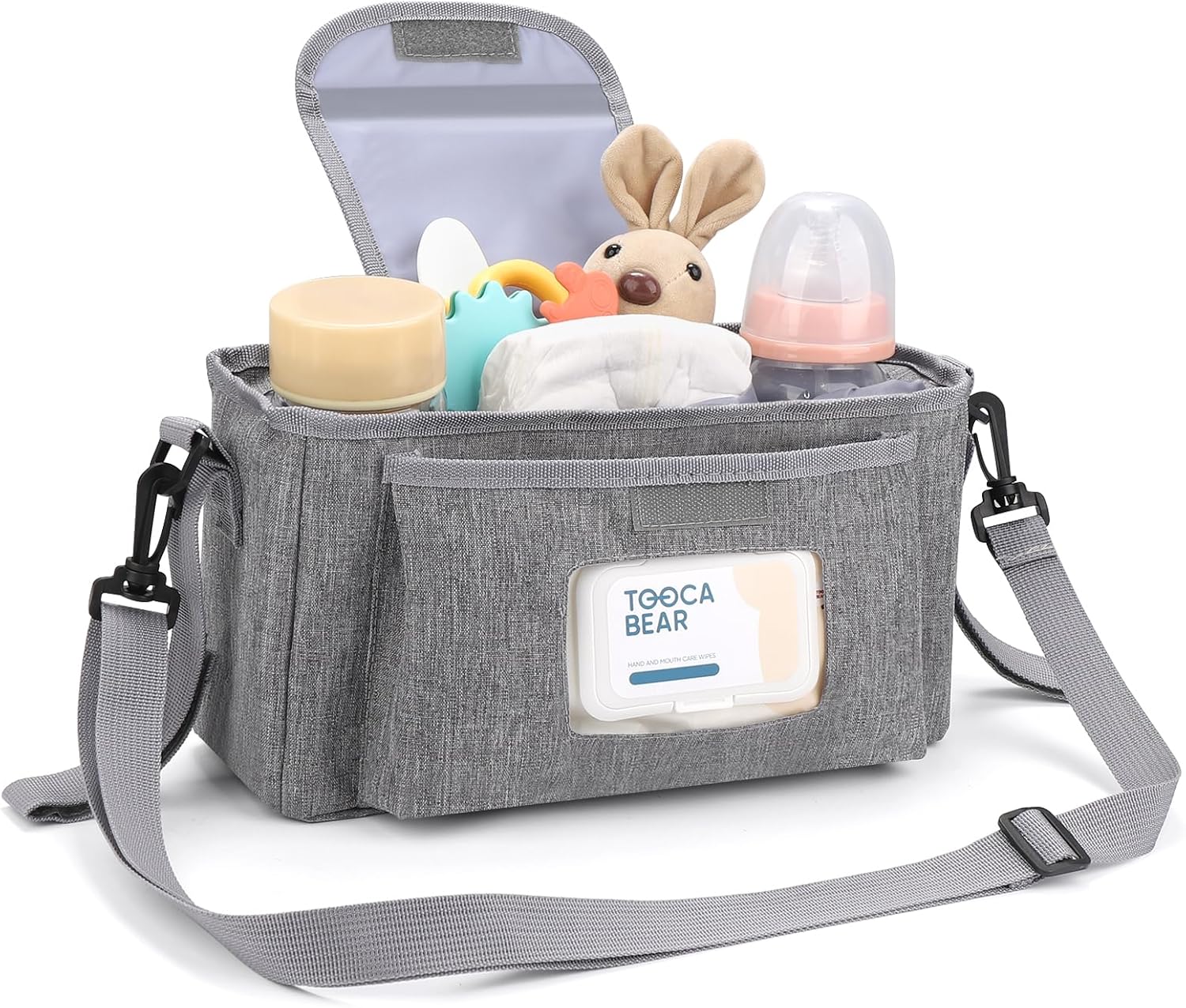 - Structured Stroller Organizer: This stroller caddy features an internal partition system that provides multifunctional compartments for efficient organization. The middle large storage compartment can storage baby diapers, toys, clothes, pacifiers or other accessories; 2 insulated cup holders on two sides, can be used to place baby bottles, beverage cups, water bottles etc. A convenient open pocket on the front for easy access to wet wipes or tissue.