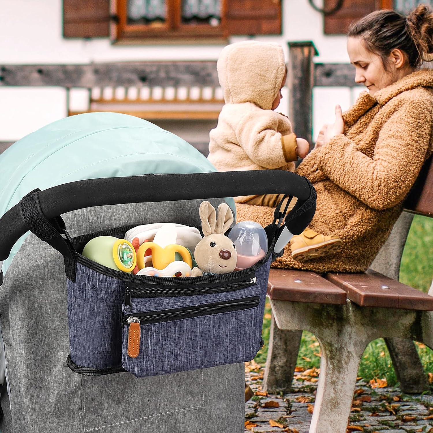 - Large Capacity : The middle large storage compartment can storage baby diapers, toys, clothes, pacifiers or other accessories; 2 cup holders on two sides, can be used to place baby bottles, beverage cups, water bottles etc; Zipper pocket can hold important items such as cell phone.