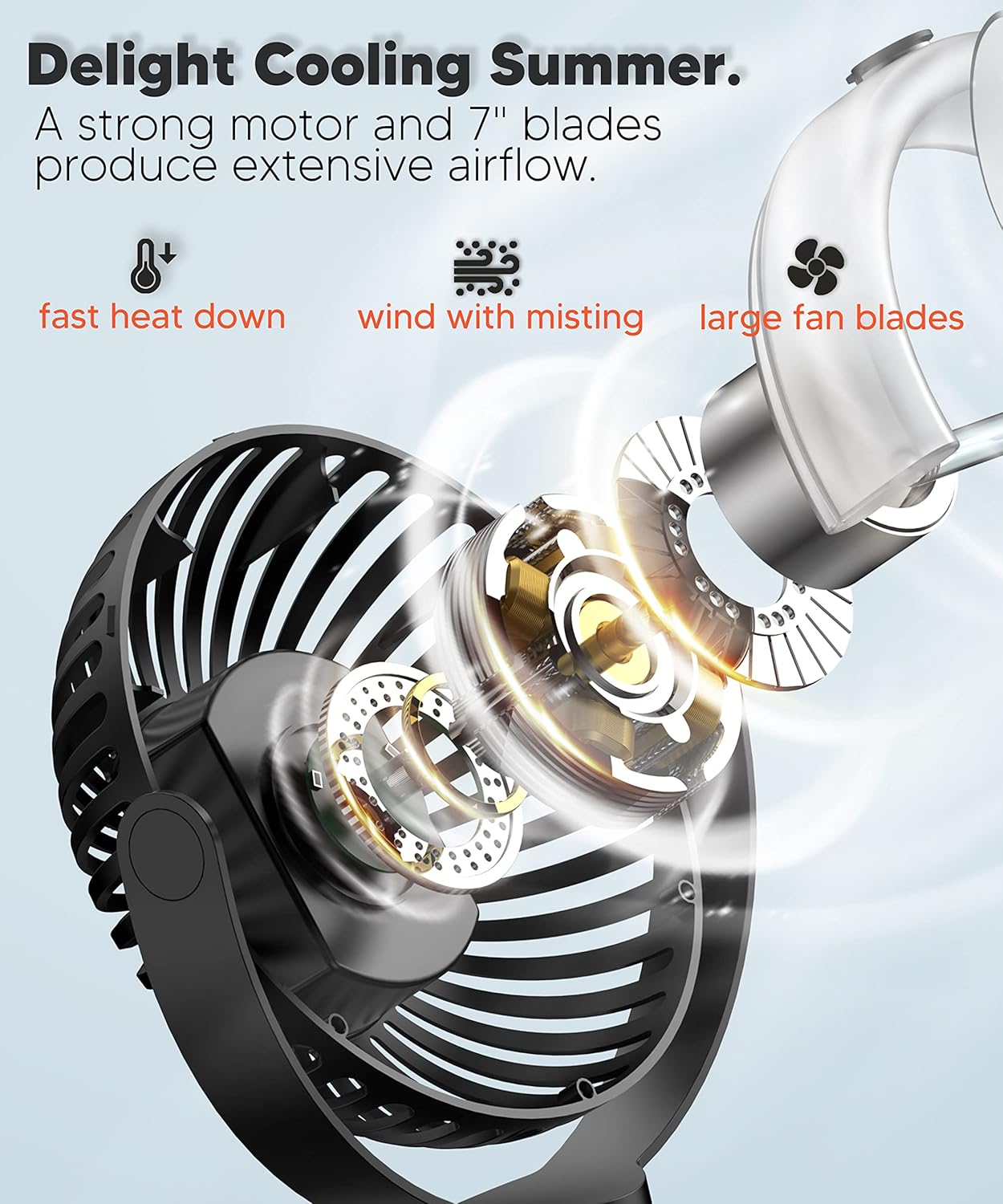 - 【Portable Fan, 360°Rotation】TYZU misting fan is made of sturdy and durable ABS material. It has a flexible tripod for easily and firmly clipping on baby stroller, golf carts, crib, car seat, treadmills, bike or bunk bed. This rechargeable fan with mist can be rotated 360° horizontally and vertically, you can enjoy the cool airflow and moisture from all angles. (Note: During use, please keep the water injection hole facing up when the tank is filled with water)