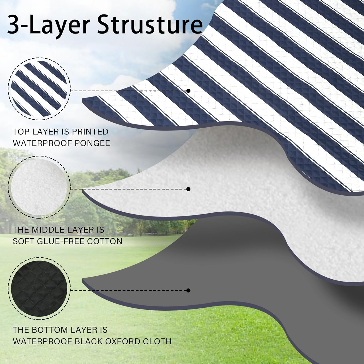 - 【Soft and Durable with 3-Layers】The picnic blanket top layer is printed waterproof pongee, the middle layer is soft glue-free cotton, and the bottom layer is waterproof black Oxford cloth. Perfectly suitable for siting or lying on grass, beach, floor or any kindly of surface, giving you soft and comfortable feelings.