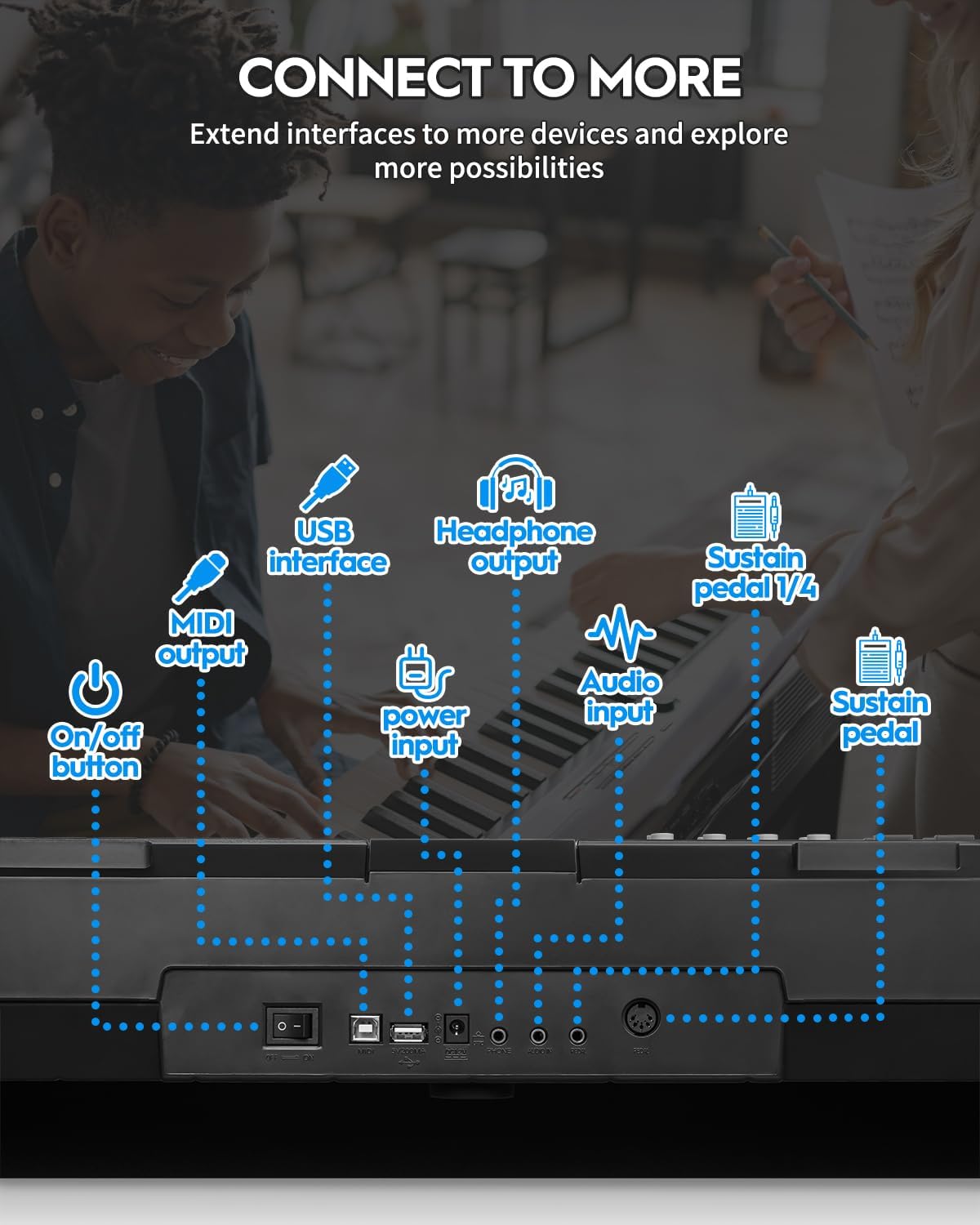 - 【VERSATILE CONNECTIVITY】Built-in wireless MIDI, along with USB, MIDI, and audio inputs, offer a flexible setup for connecting to speakers or headphones without disturbing others, making music creation, editing, and sharing straightforward