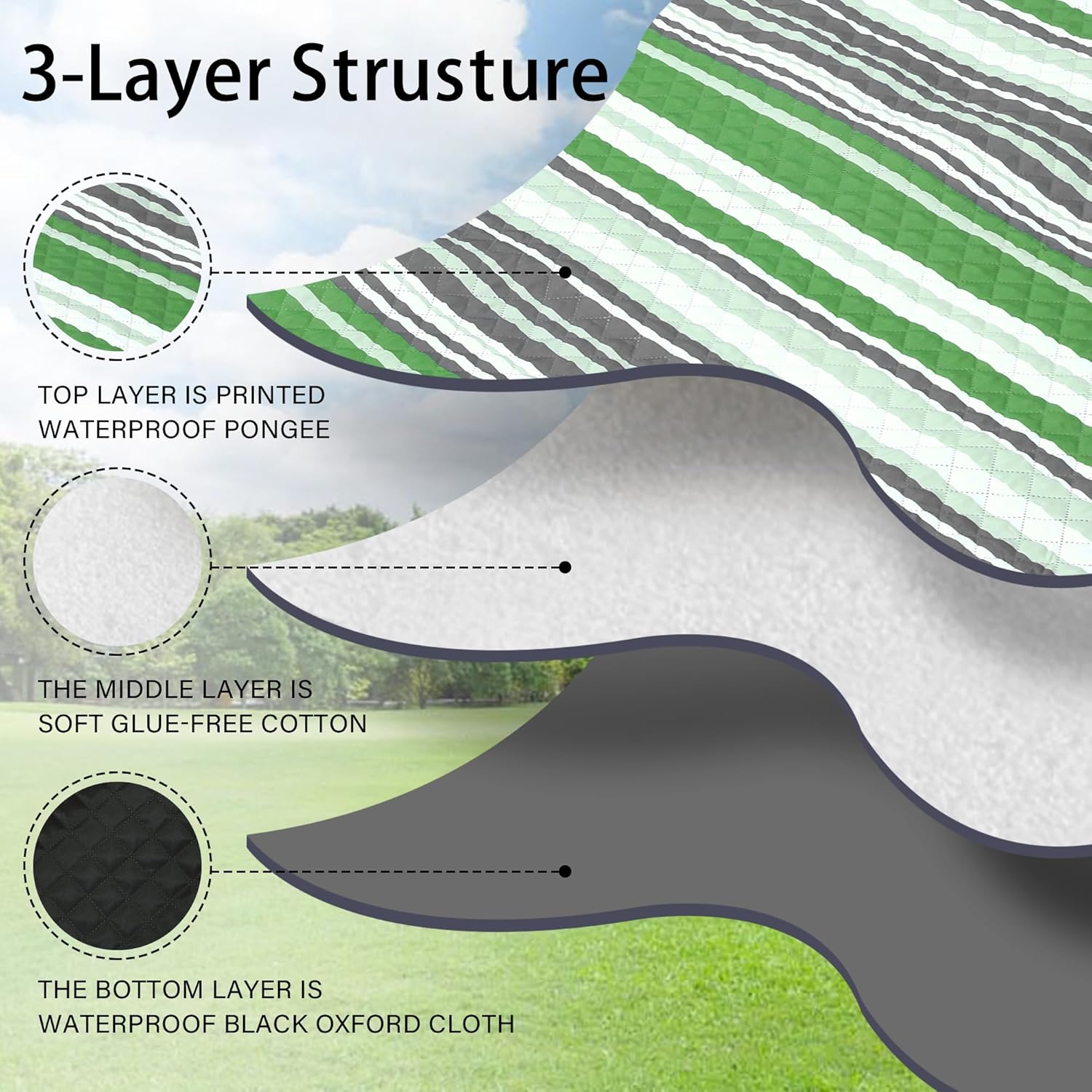 - 【Soft and Durable with 3-Layers】The picnic blanket top layer is printed waterproof pongee, the middle layer is soft glue-free cotton, and the bottom layer is waterproof black Oxford cloth. Perfectly suitable for siting or lying on grass, beach, floor or any kindly of surface, giving you soft and comfortable feelings.