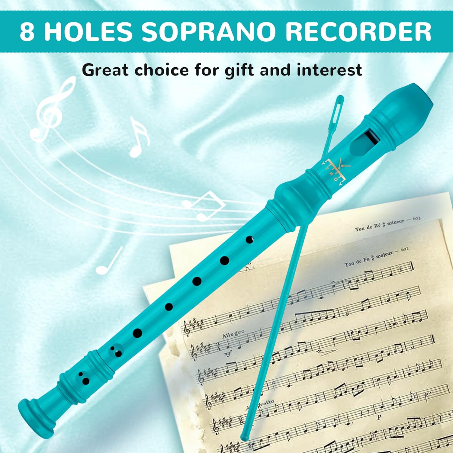 Soprano Recorder 8-Hole Instrument for Beginners Kids Students, Baroque Style C Key Flute with Cleaning Rod & acking Bag for Education & Entertainment - Cyan