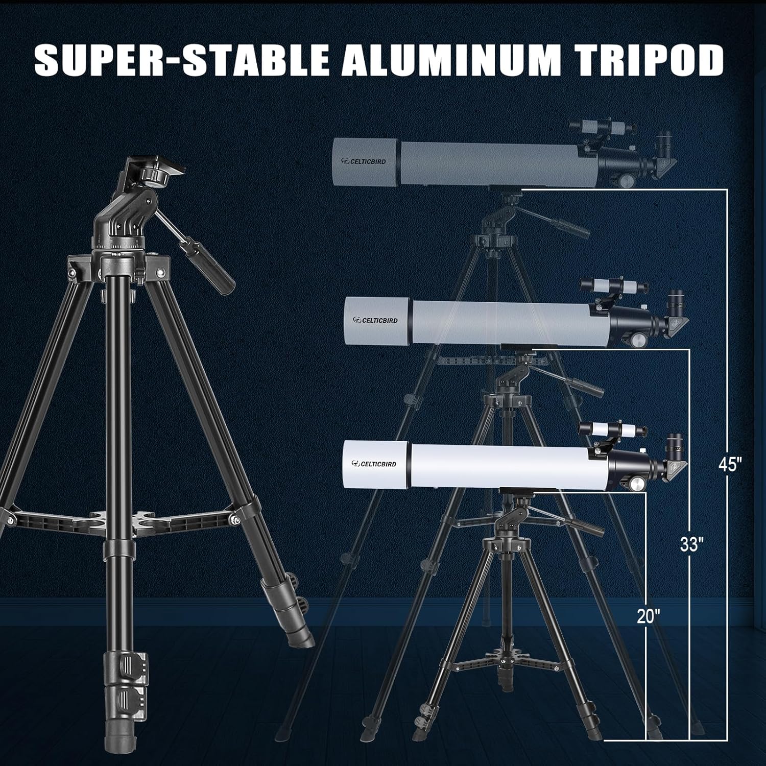 - 【Portable & Stable】Our refractor telescope has a carry case, an adjustable aluminum tripod and an upgraded phone adapter. All accessories can be packed into the bag, which is convenient for you to carry and storage for traveling. The tripod is stable and the height can adjust from 20" to 45", which is suitable for adults and teenagers