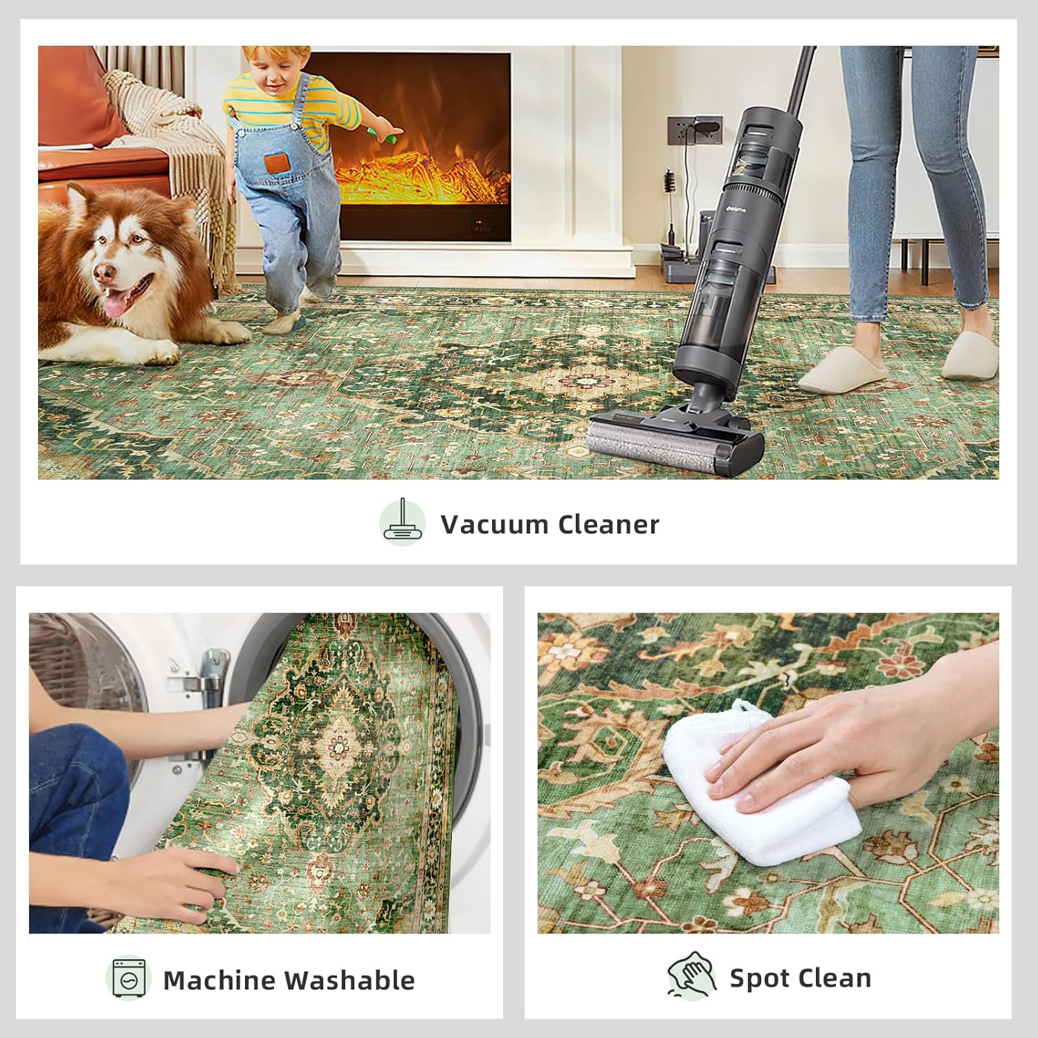 Deerly Green Rug 3x5 Area Rug with Non-Slip Backing, Washable Rugs for Bedroom Living Room Kitchen, Distressed Carpet Printed Low-Pile Soft Dorm Rug Room Decor(Border Green)