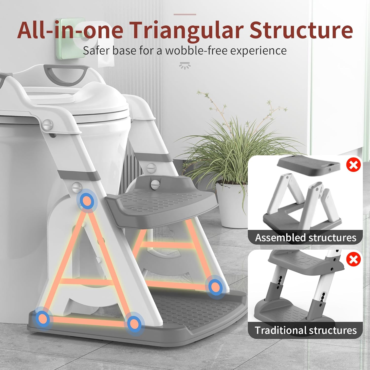 - 【Safer Triangular Structure】 MeuLife potty training seat features an exclusive integrated triangular structure, which offers superior stability compared to assembled triangular and traditional structures, effectively addressing common issues of seat wobbling. Coupled with a widened pedal measuring 15.7x7.1 inches, it completely alleviates children's fear of falling or climbing during potty training.