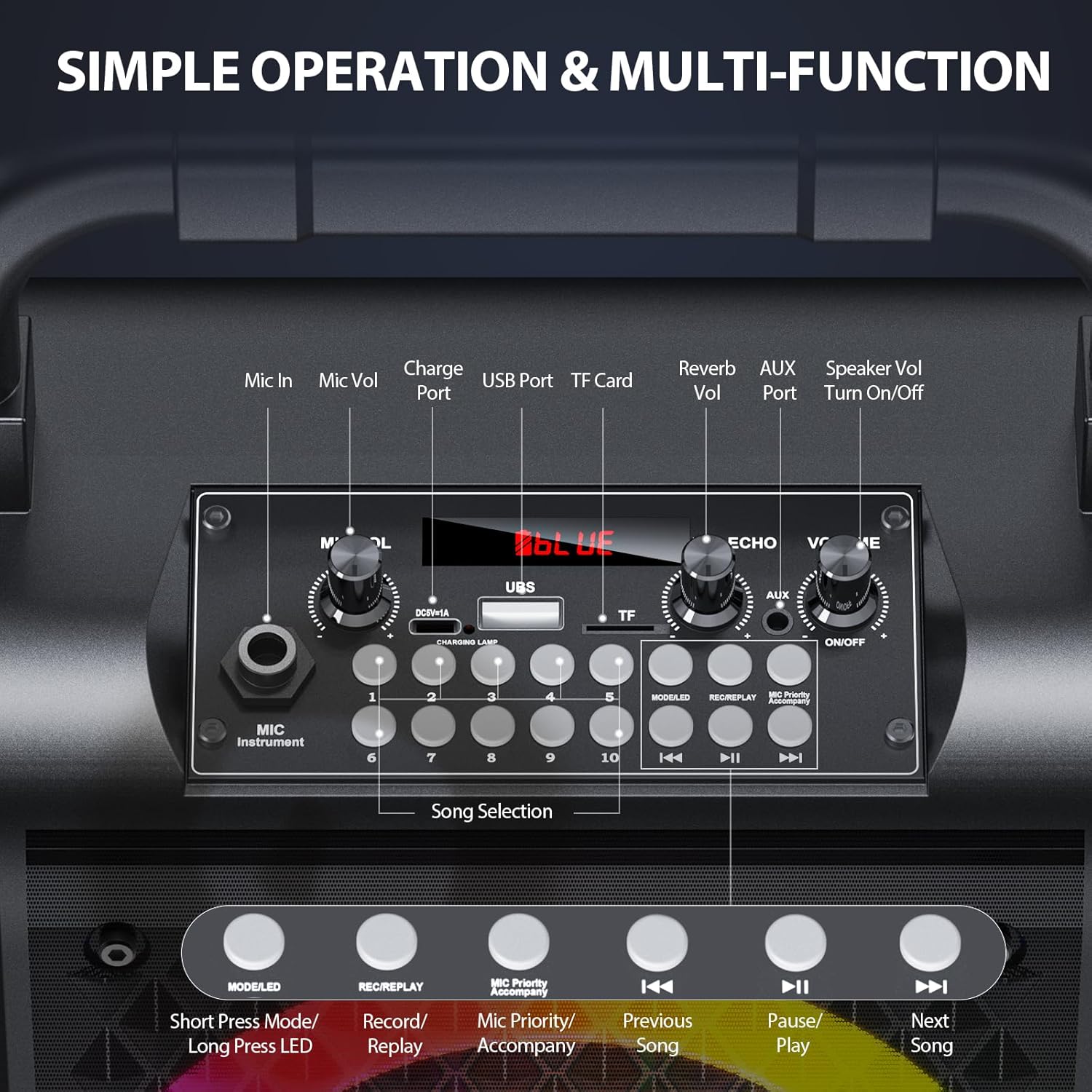 - 🎶𝐌𝐮𝐥𝐭𝐢𝐟𝐮𝐧𝐜𝐭𝐢𝐨𝐧𝐚𝐥 𝐊𝐚𝐫𝐚𝐨𝐤𝐞 𝐌𝐚𝐜𝐡𝐢𝐧𝐞: The karaoke machine for adults & kids adopts Bluetooth 5.3 and 2024 NEW DSP chip, you will enjoy more stable and longer-distance transmission without interference. Karaoke microphone speaker also supports Micro TF cards /USB, and AUX connections, this karaoke speaker is compatible with Android phones, iPhones, iPads, TV, and PC. It is an ideal choice for family gatherings, street dancing, and church.